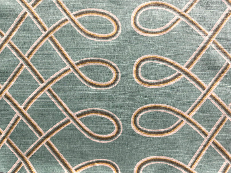 -White, Olive Green, Gold Loops on Sea Green Printed Cotton Linen Drapery Fabric by Robert Allen (Border Print)
