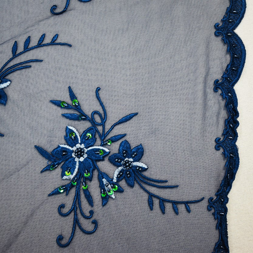 -100% Polyester scalloped selvedge mesh tulle fabric embroidered with an African inspired pattern with florals, and hints of beads and sequins for that added detail