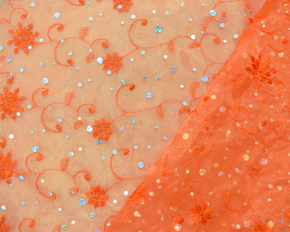 -Orange-Silver Poly Metallic Floral Embroidery Scallop Organza Woven Fabric