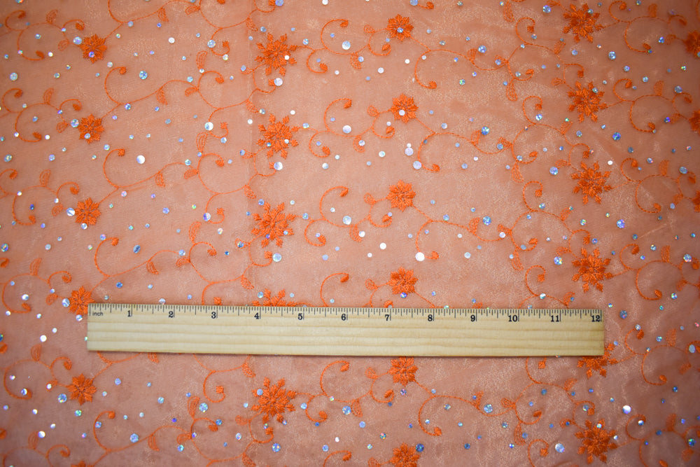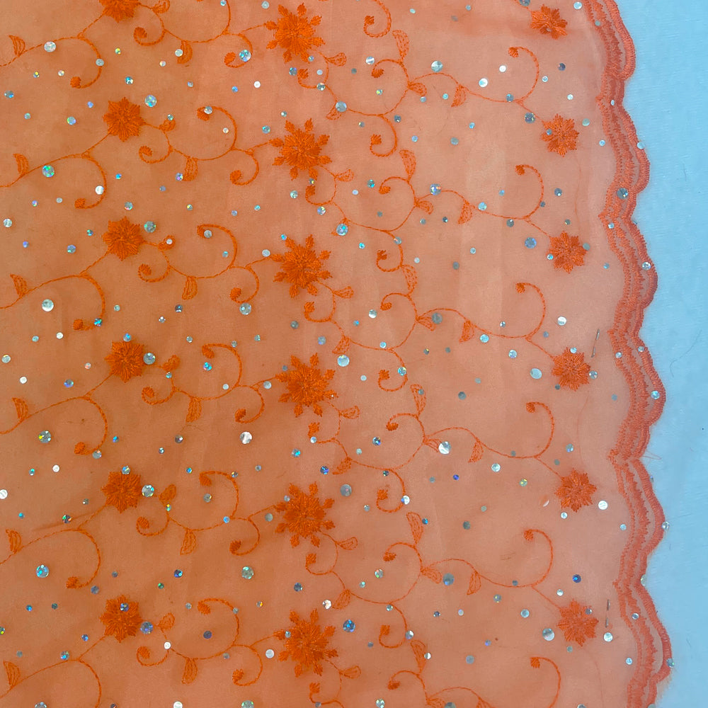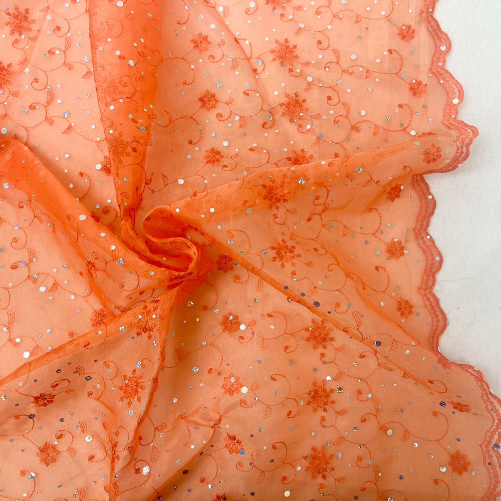 Orange-Silver Poly Metallic Floral Embroidery Scallop Organza Woven Fabric