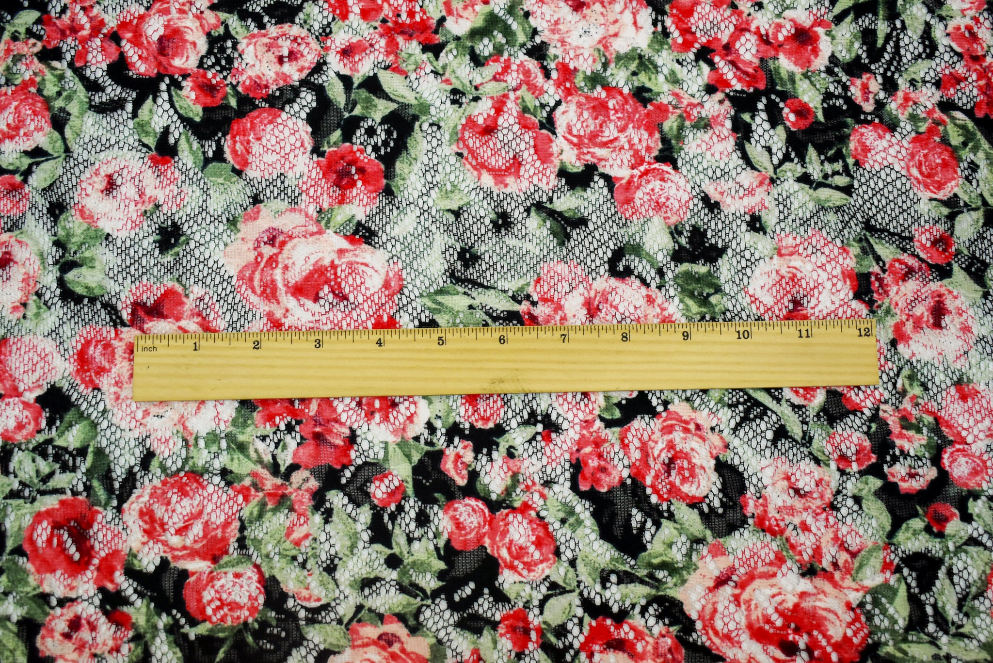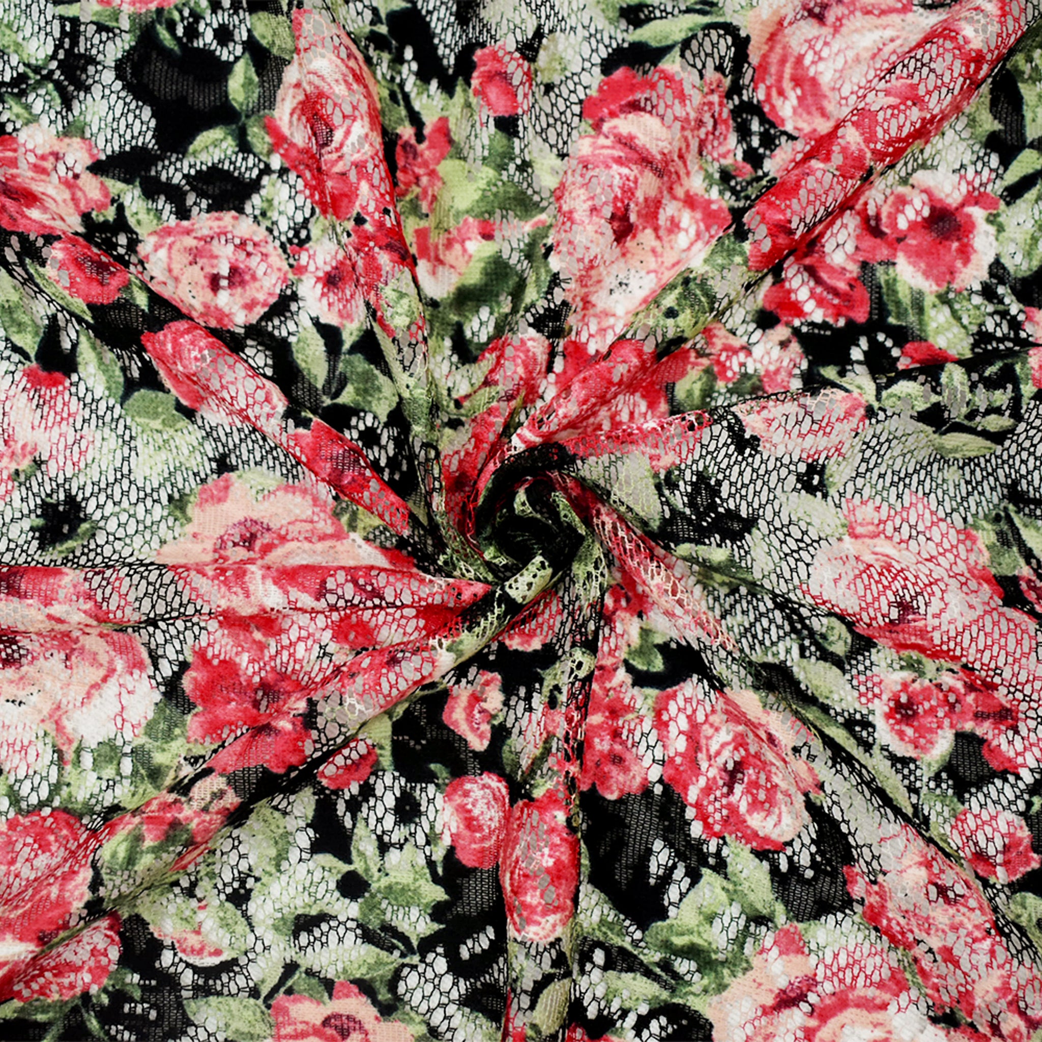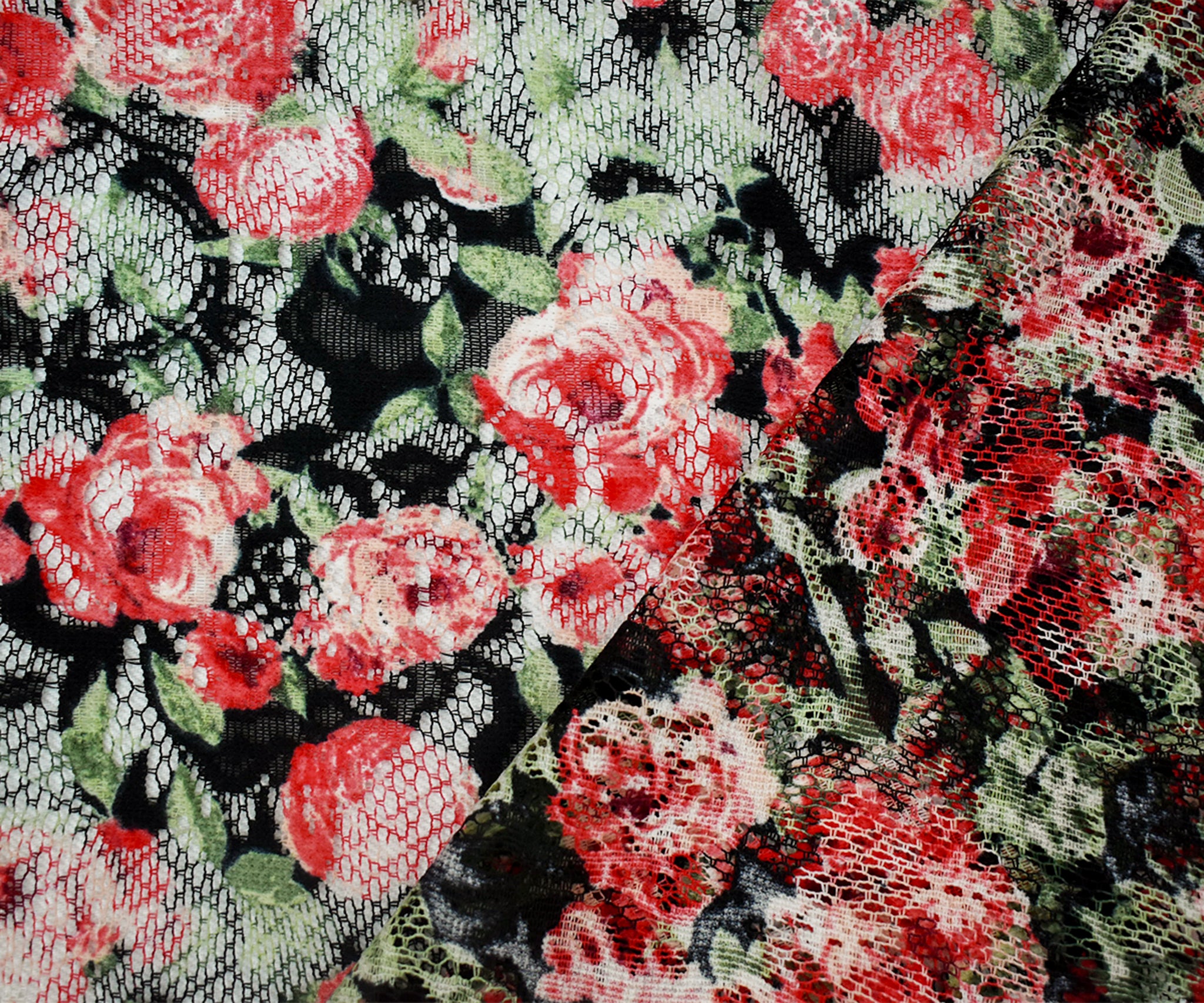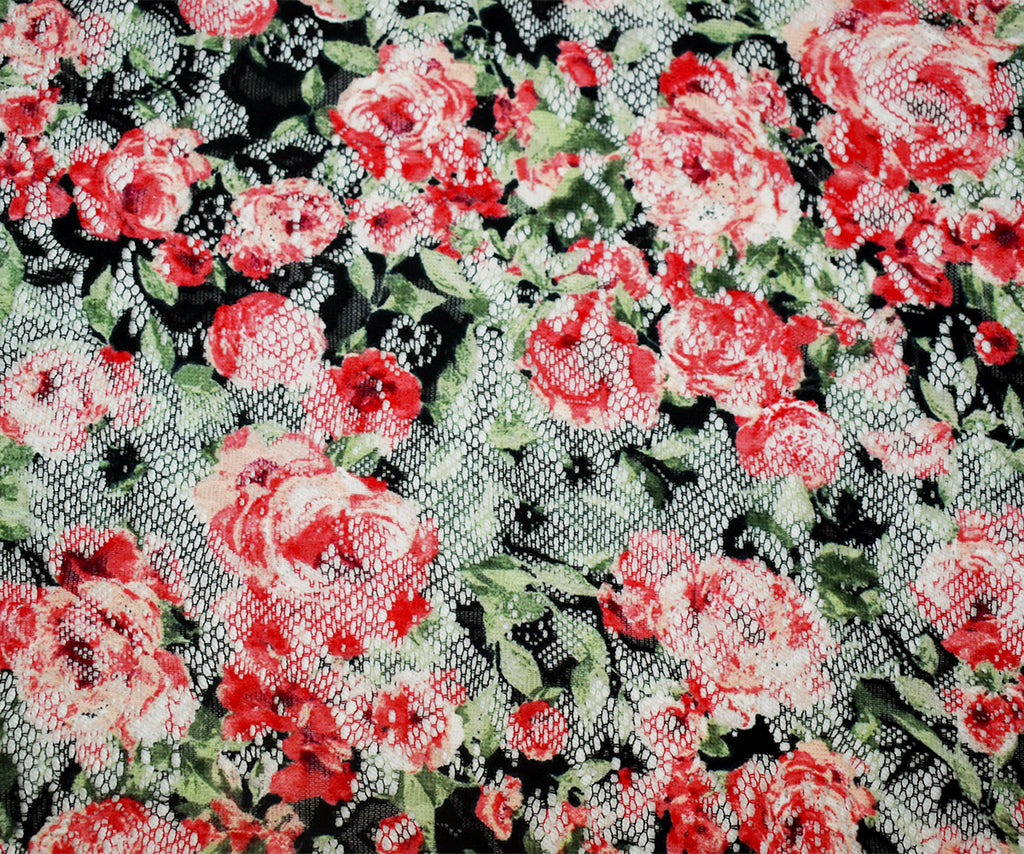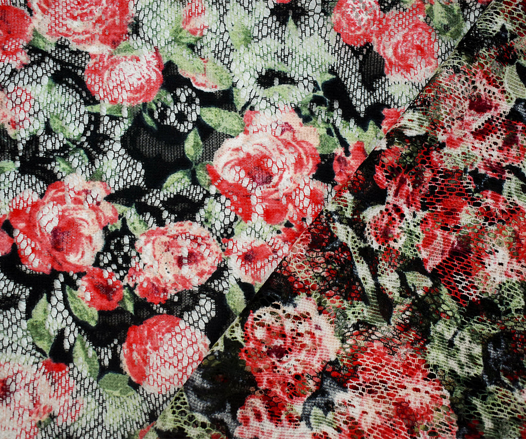 Red-Green-Multi Poly Rayon Floral Printed Crochet Lace Knit Fabric