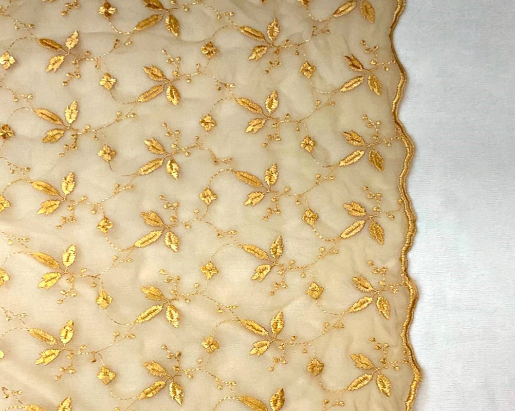 Tan Beige Nylon Floral Leaf Vine Embroidered Mesh Knit Fabric