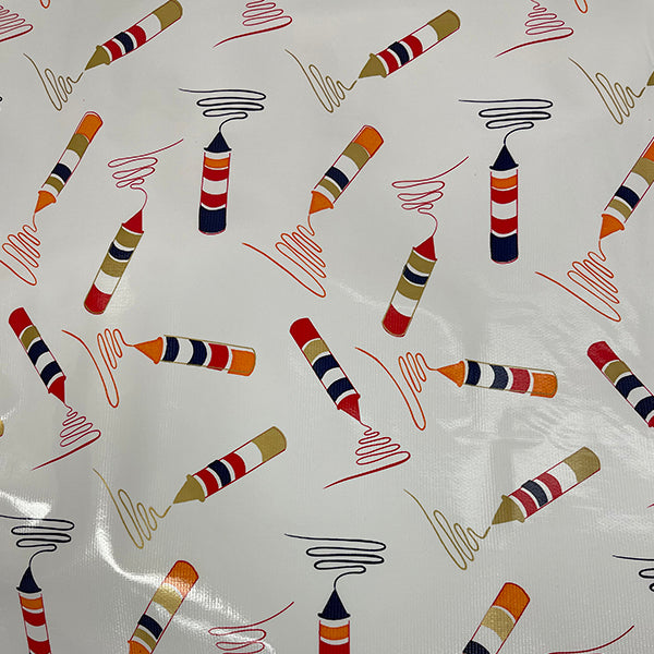 Black, Red, Orange, and Metallic Gold Crayon Print on Red Oilcloth Fabric