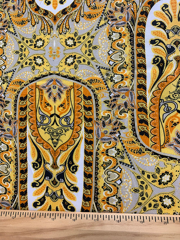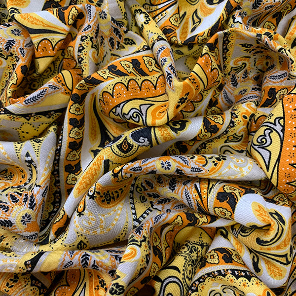 -Yellow, White, Black, Orange, & Beige Multi Paisley Print Challis Fabric