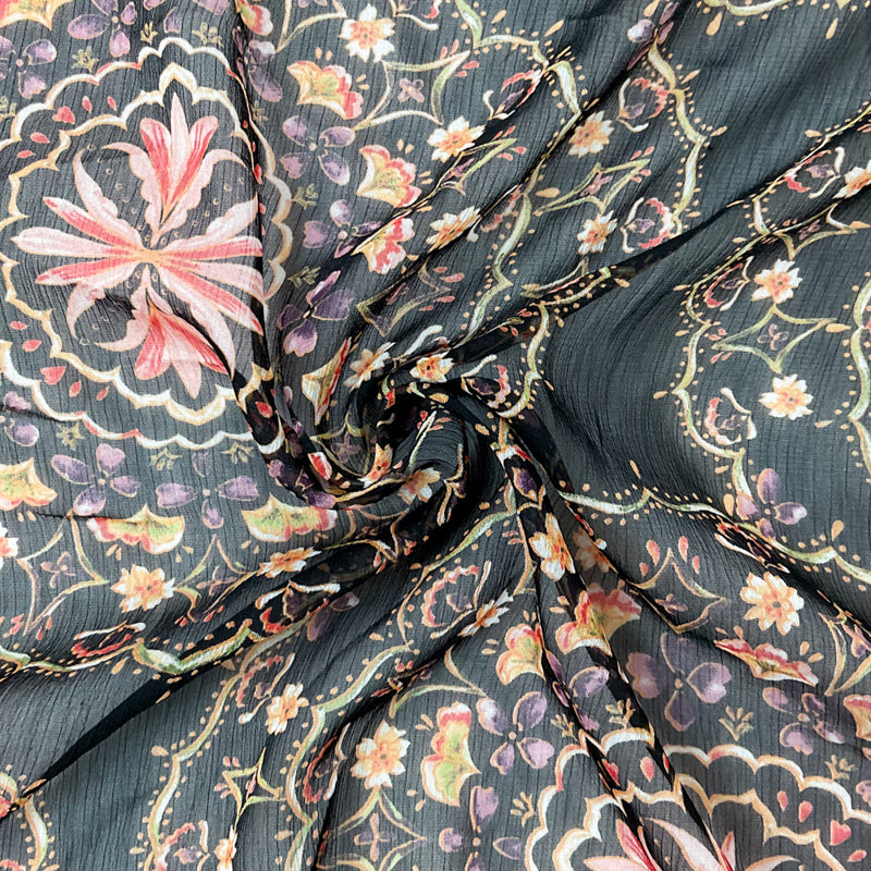 Black-Multi Poly Floral Printed Yoryu Chiffon Woven Fabric