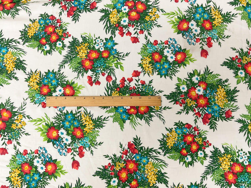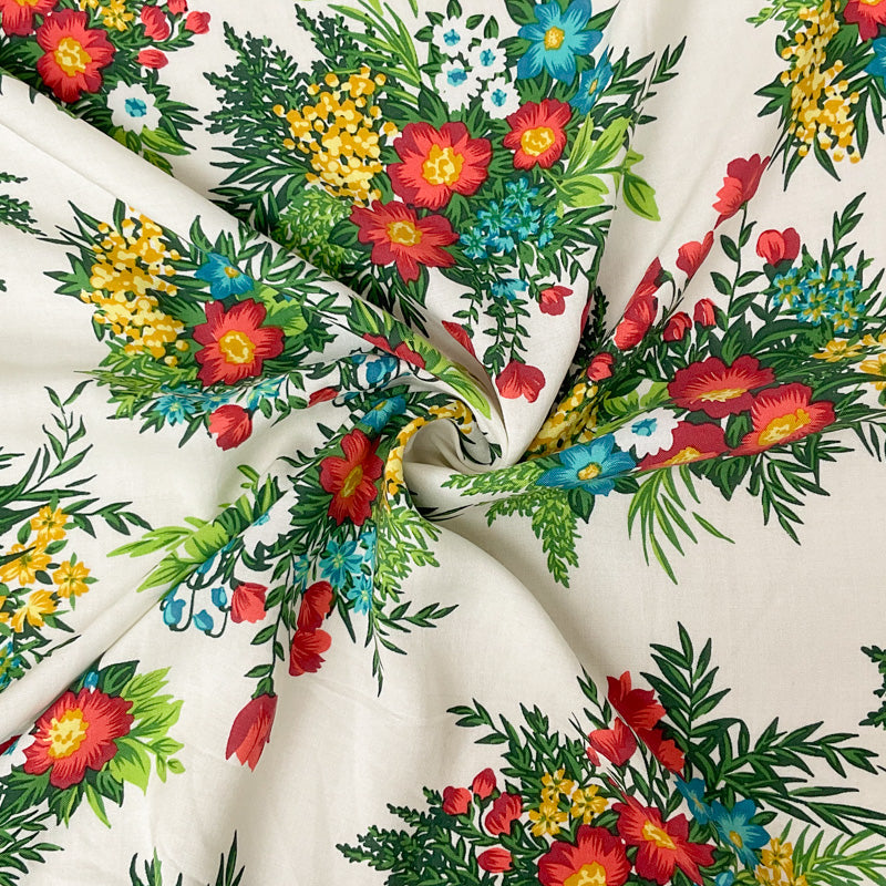 -Featuring a vibrant floral print, this rayon challis maintains its signature lightweight and fluid drape. The soft woven construction is perfect for creating flowing summer dresses and elegant scarves.