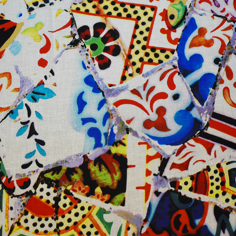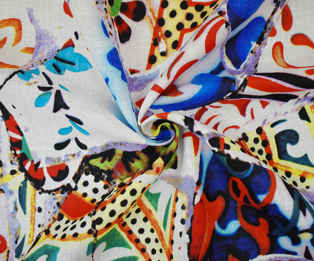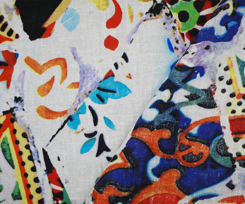 -100% linen plain woven fabric printed with a collage stylized pattern with various abstract shapes with dots and baroque-like elements.Line if needed.