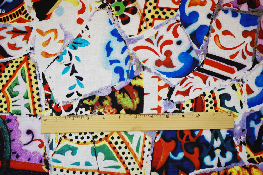 Blue-Orange-Multi Abstract Collage Pattern Printed Linen Woven Fabric