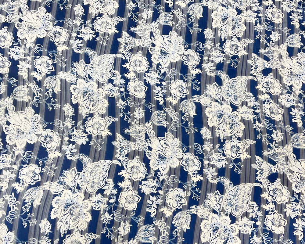 Blue-White Poly Floral Printed Satin Stripe Chiffon Woven Fabric