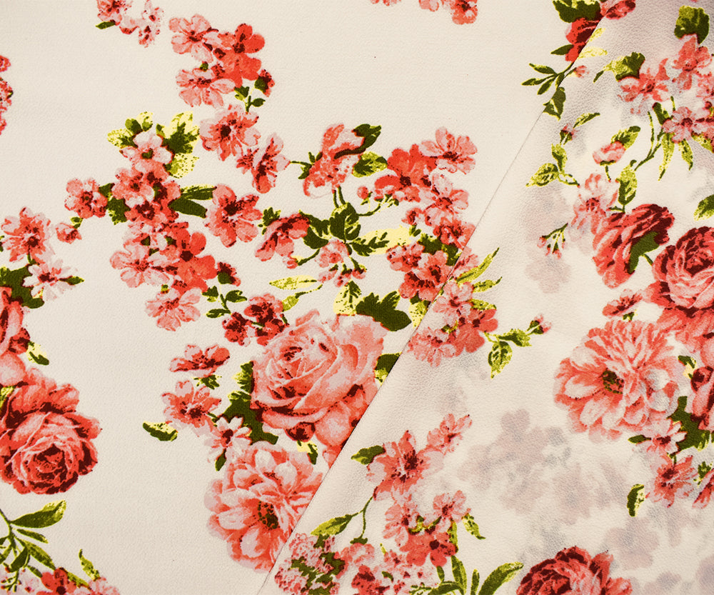 Coral-White-Multi Poly Floral Printed Pebble Crepe Woven Fabric