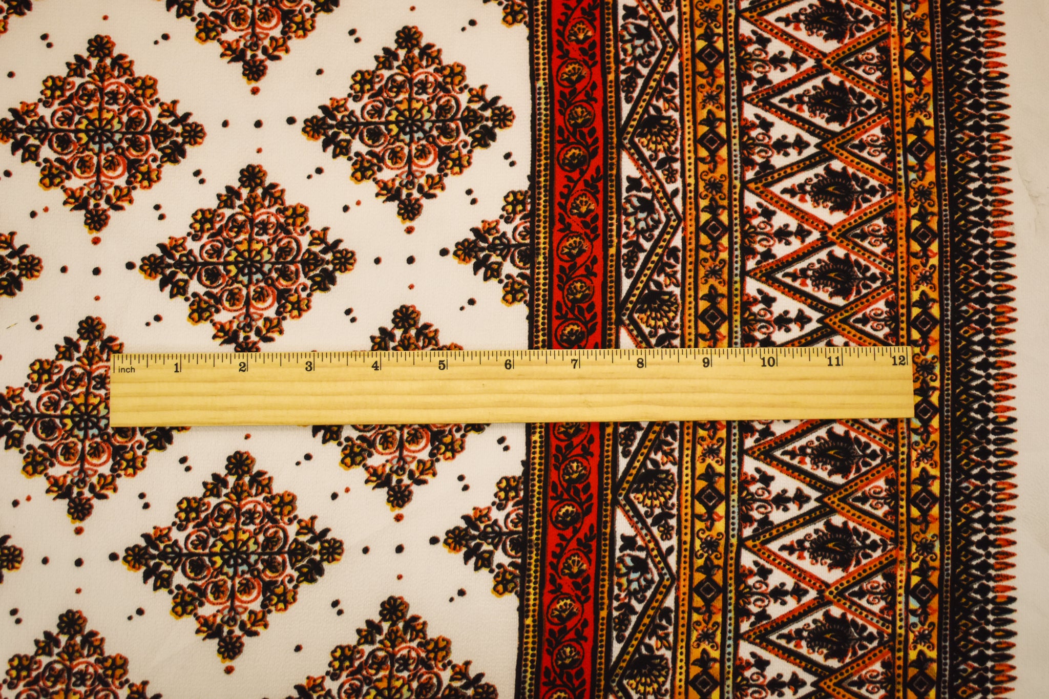 Orange-Black-Multi Poly Bordered Crest Printed Pebble Crepe Woven Fabric