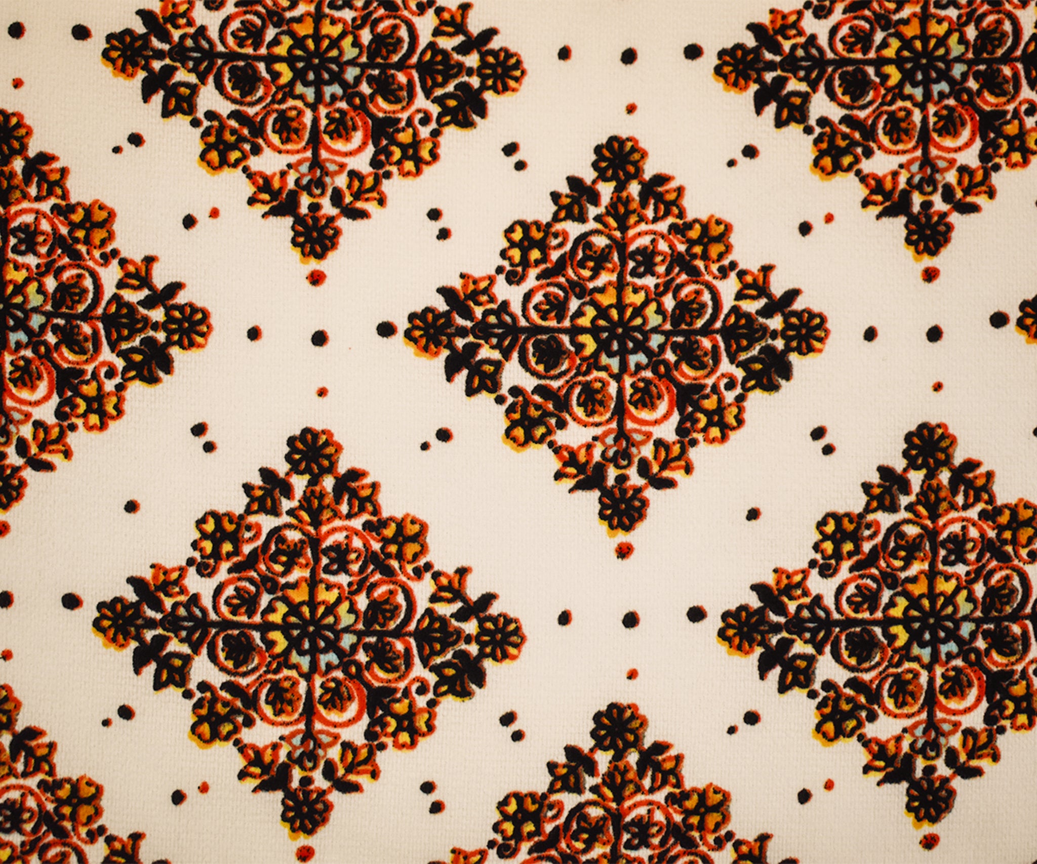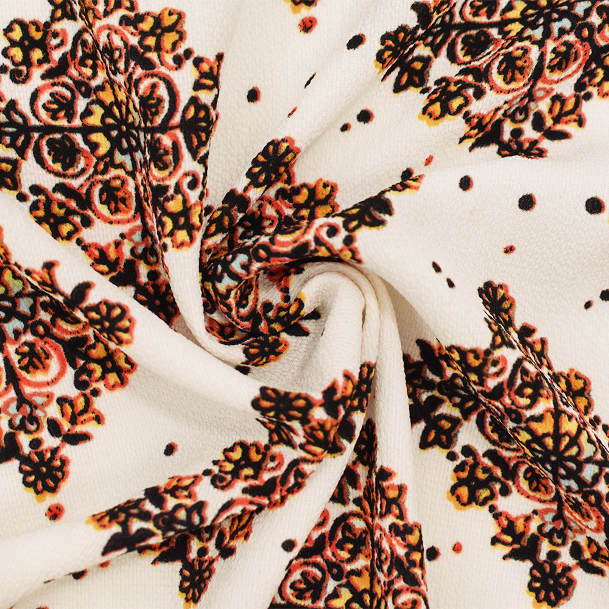 -100% Polyester pebble crepe woven fabric printed with a bordered style pattern featuring crest-like motifs, dots, and leaf elements