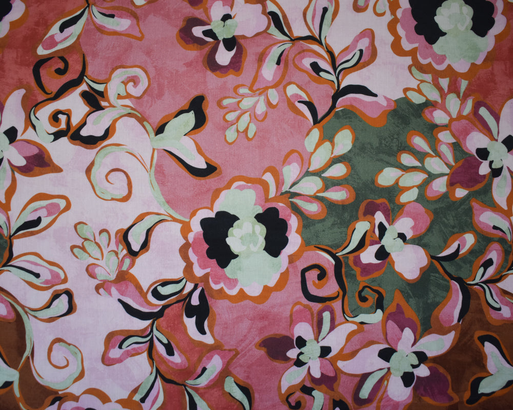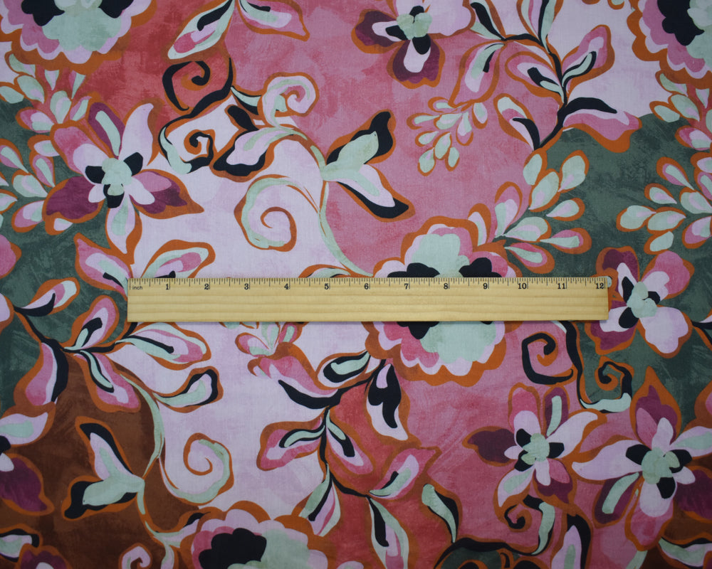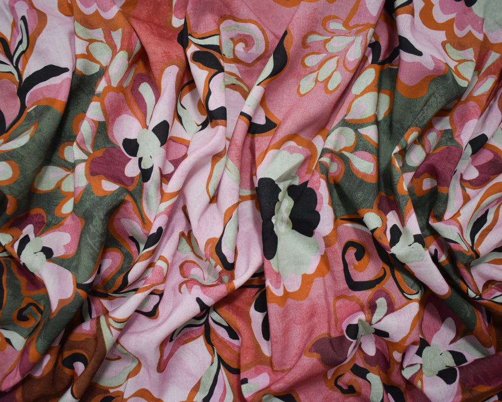 -Cotton and rayon blend plain woven lawn fabric printed with a fun stylized floral pattern