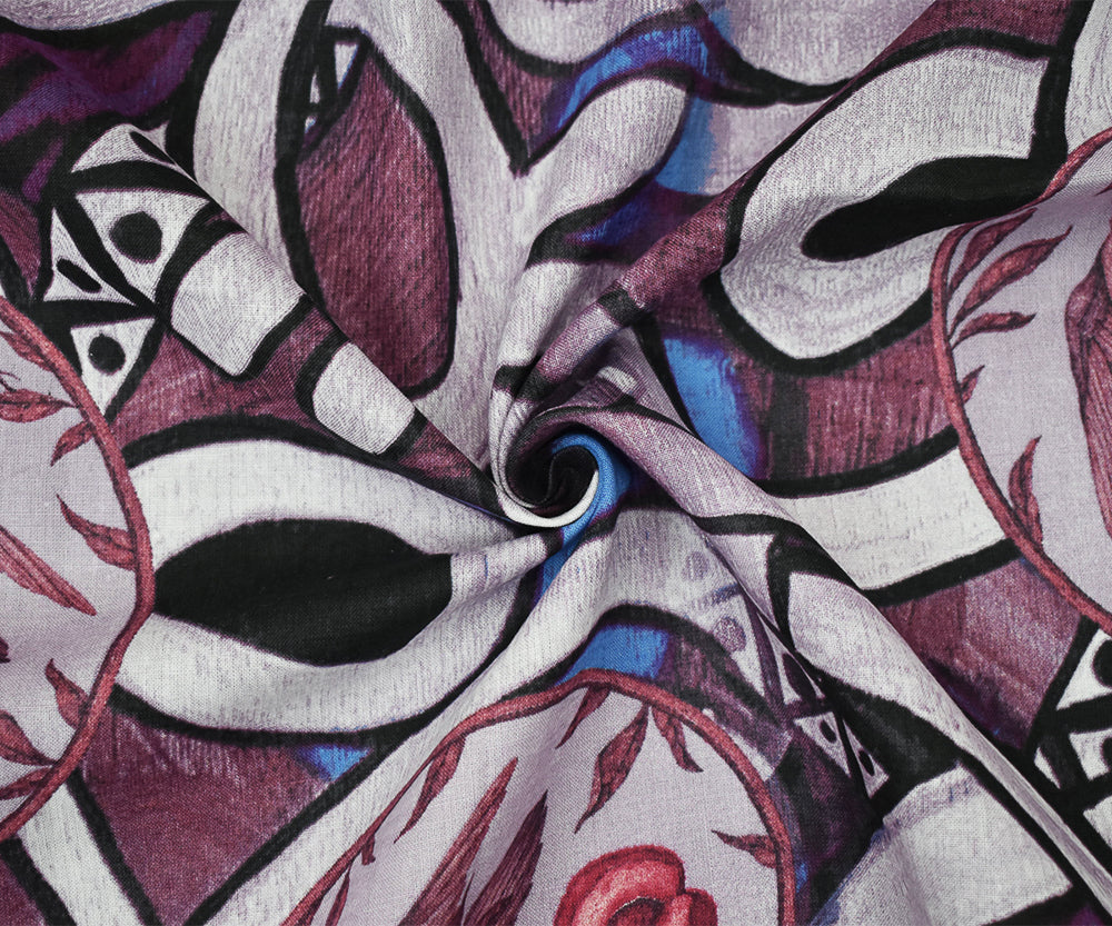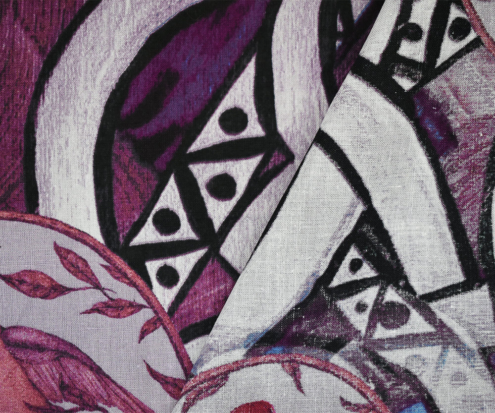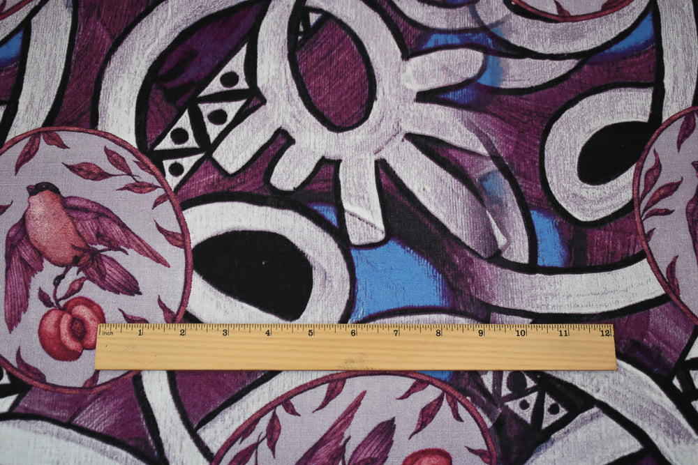 Purple-Blue-Multi Abstract Bird Fruit Pattern Printed Linen Woven Fabric