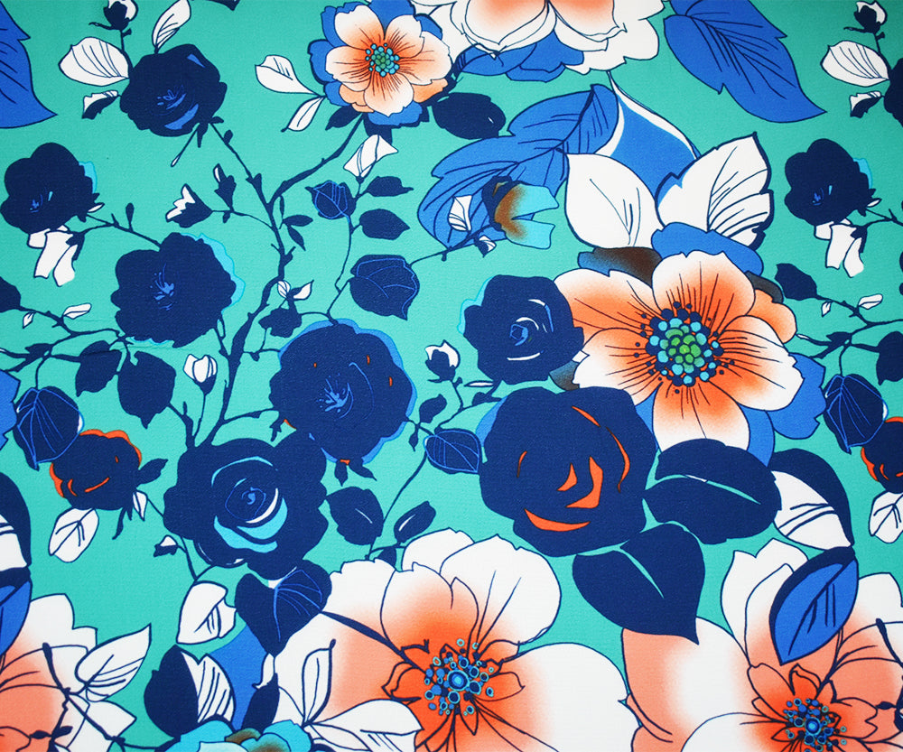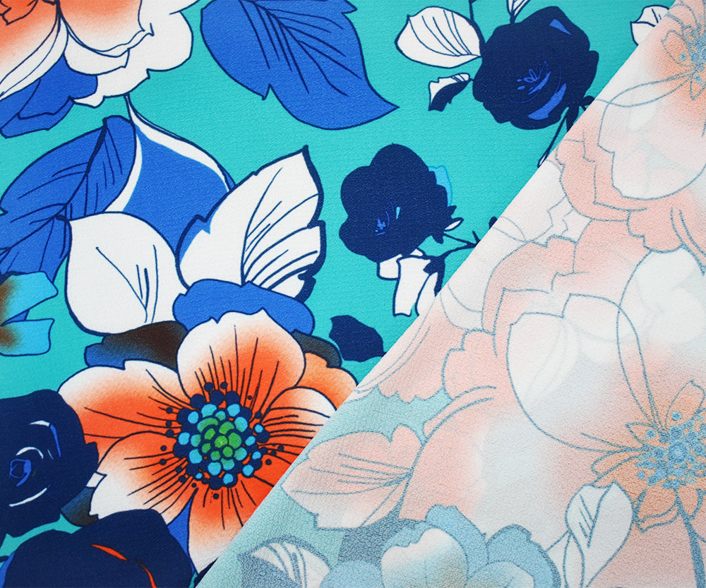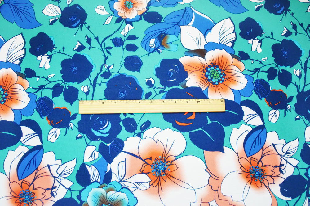 Teal-Orange-Multi Poly Floral Printed Pebble Crepe Woven Fabric