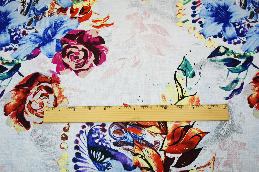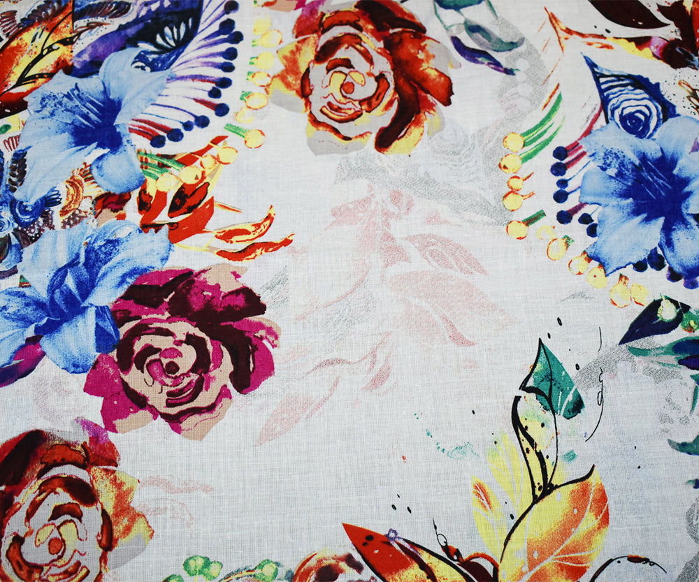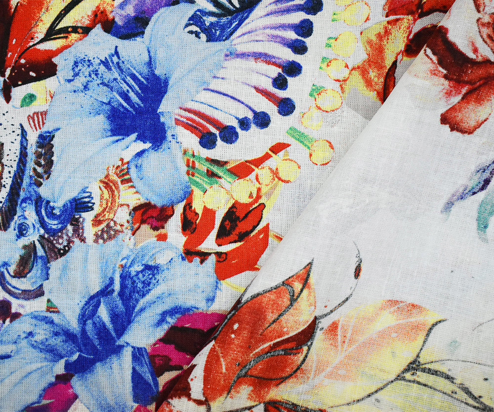 White-Fuchsia-Multi Floral Art Pattern Printed Linen Woven Fabric