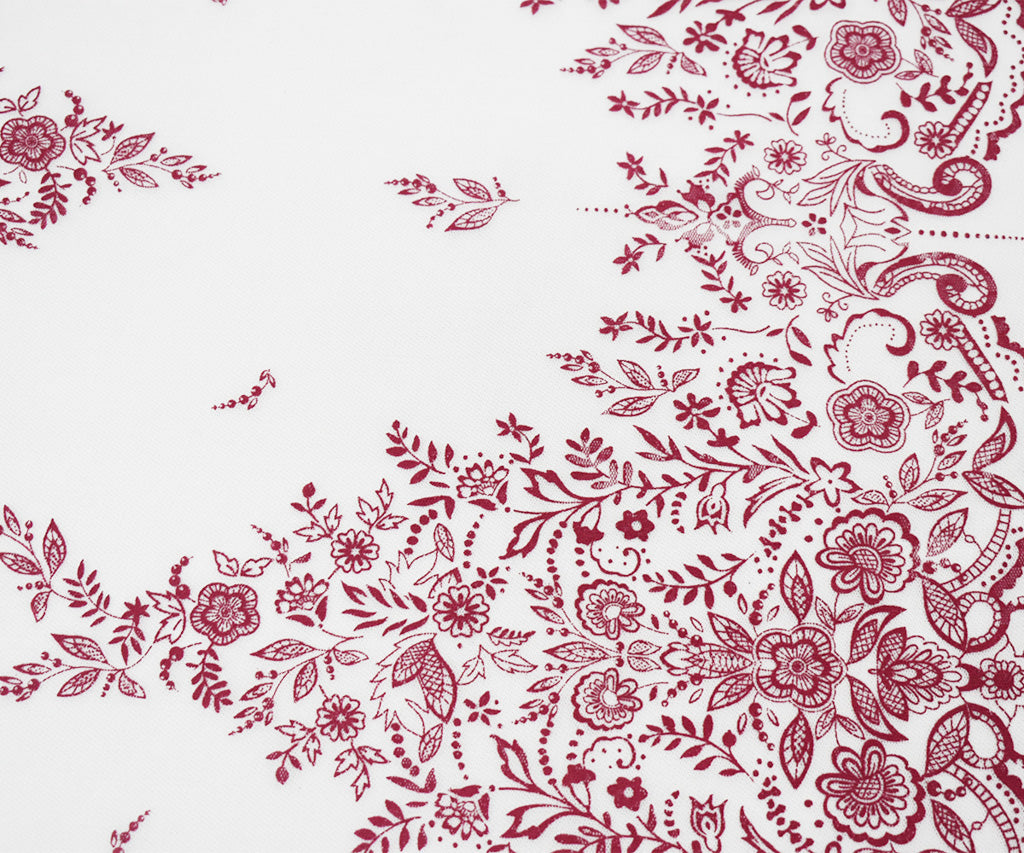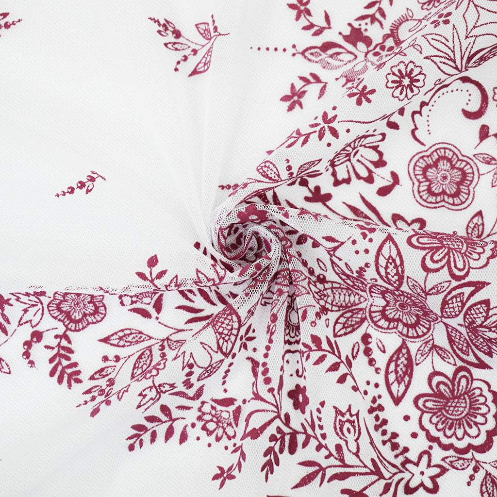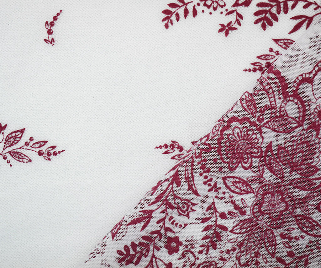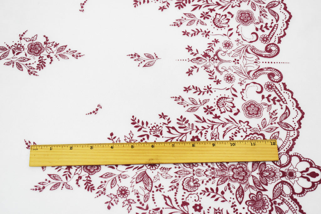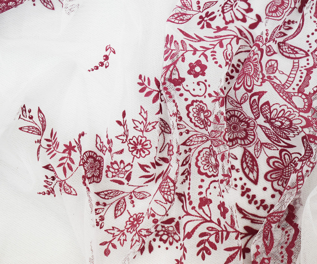 -100% Nylon mesh tulle fabric printed with florals and a scalloped border pattern