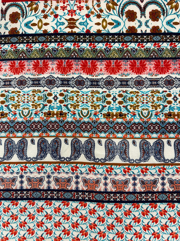 1 YD PC -White, Gold, Teal, Red, Coral, Blue, & Green Multi Woven Horizontal Floral Stripe Stretch Crepe Fabric