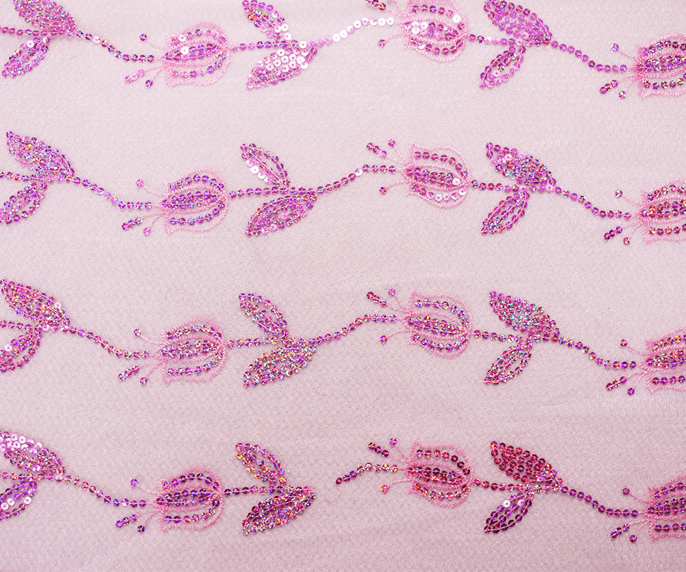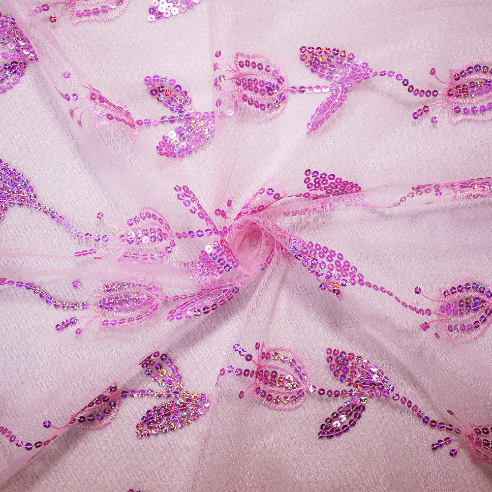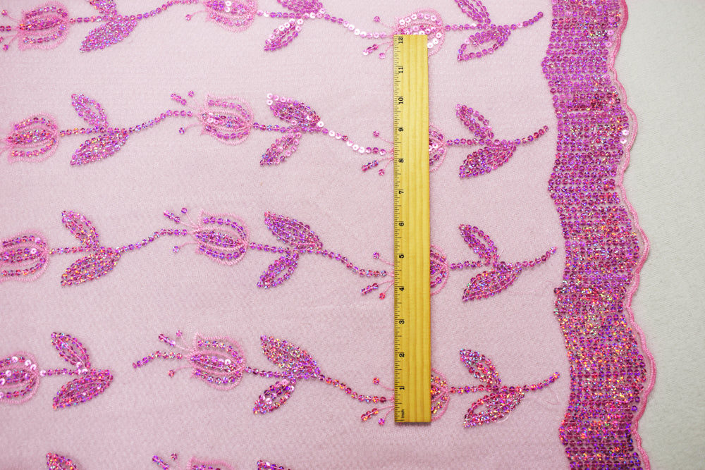 4 1/4 YD PC-Pink Nylon Embroidered Floral Tullip Sequin Scallop Tulle Mesh Fabric
