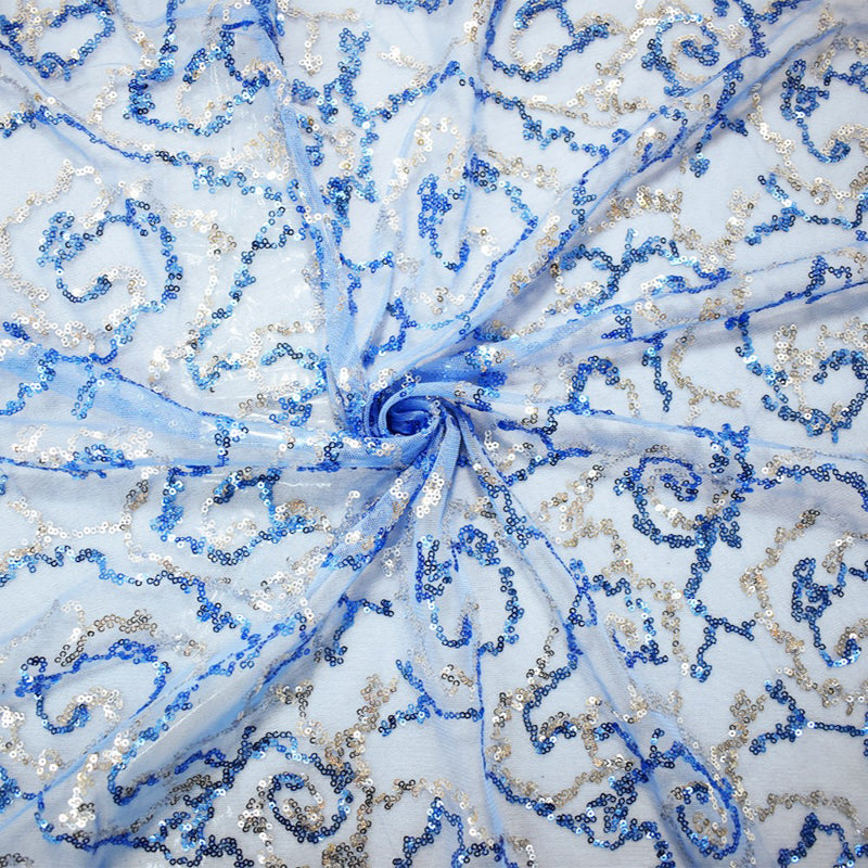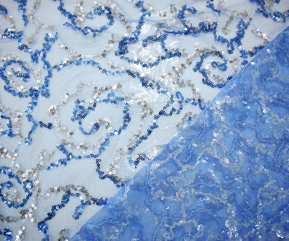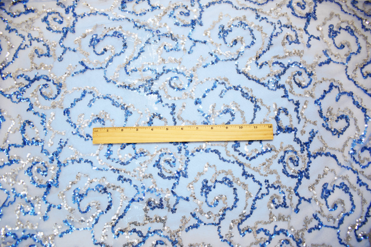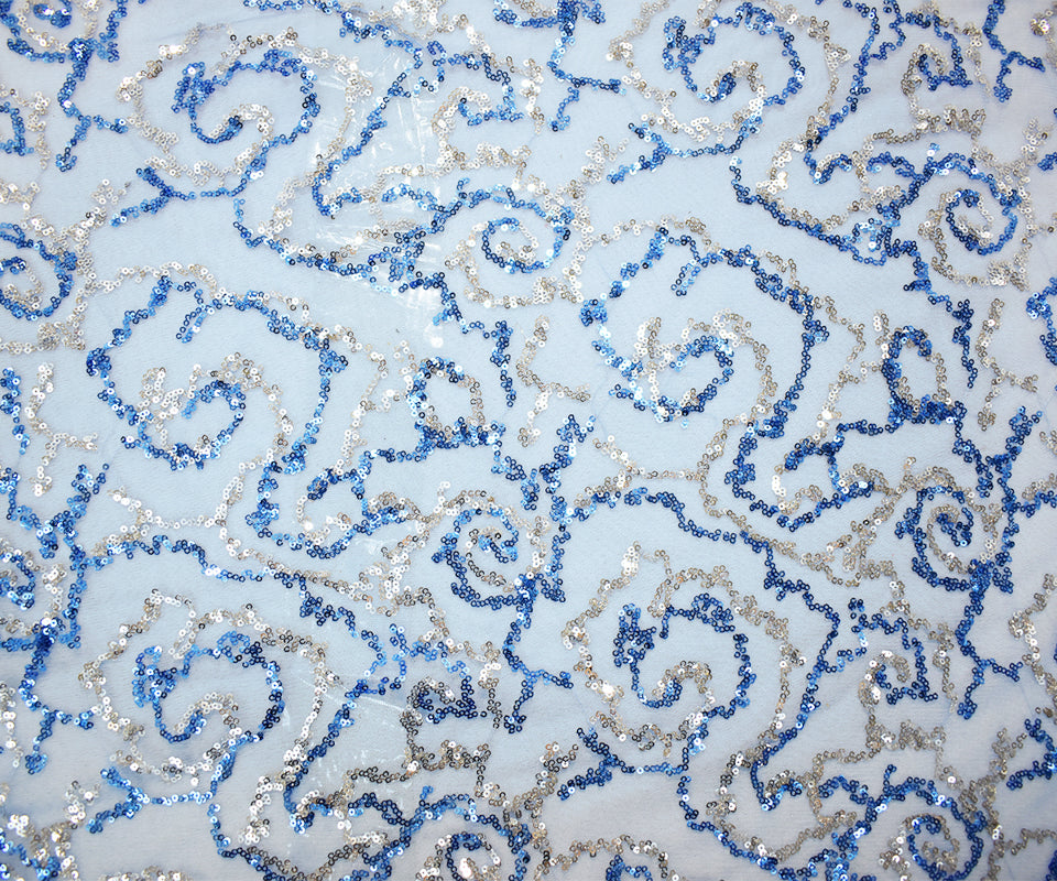Blue-Silver Nylon Sequined Abstract Swirl Mesh Tulle Fabric