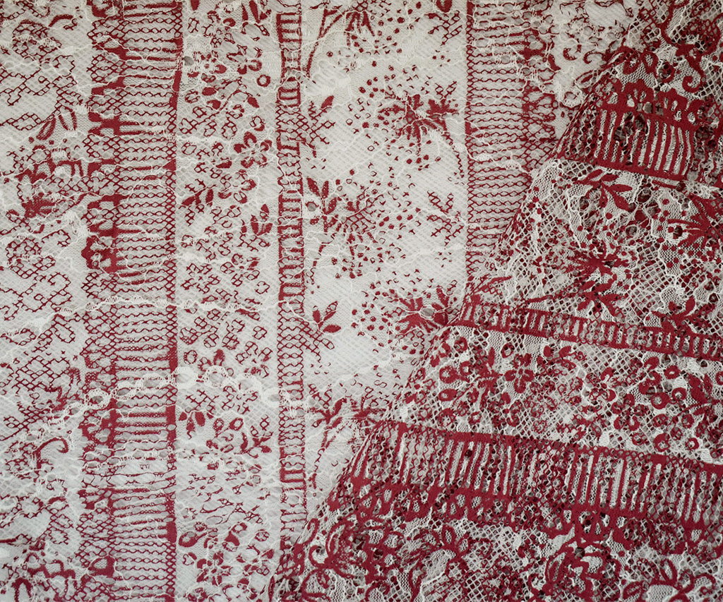 Red-White Nylon Floral Stripe Printed Lace Mesh Knit Fabric