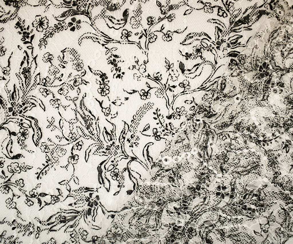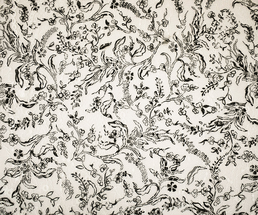 White-Black Nylon Floral Vine Printed Lace Mesh Knit Fabric