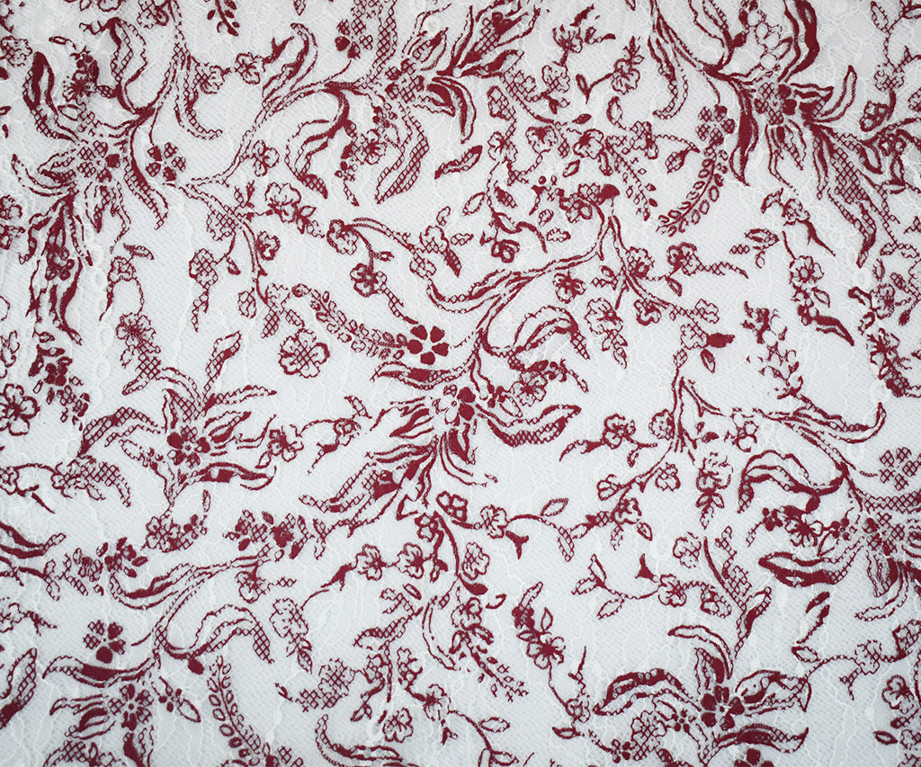 White-Deep Red Nylon Floral Vine Printed Lace Mesh Knit Fabric