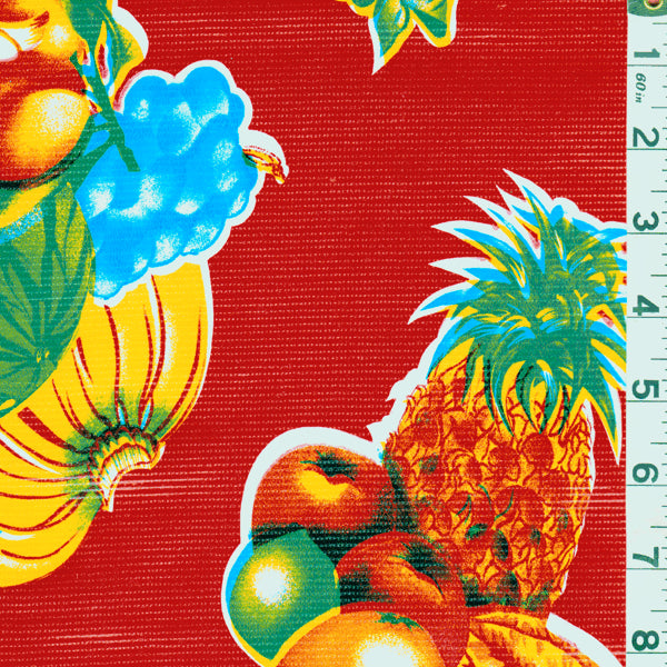 Yellow, Blue, Green, Orange, White, and Red Tropical Fruit Print on Red Oilcloth Fabric