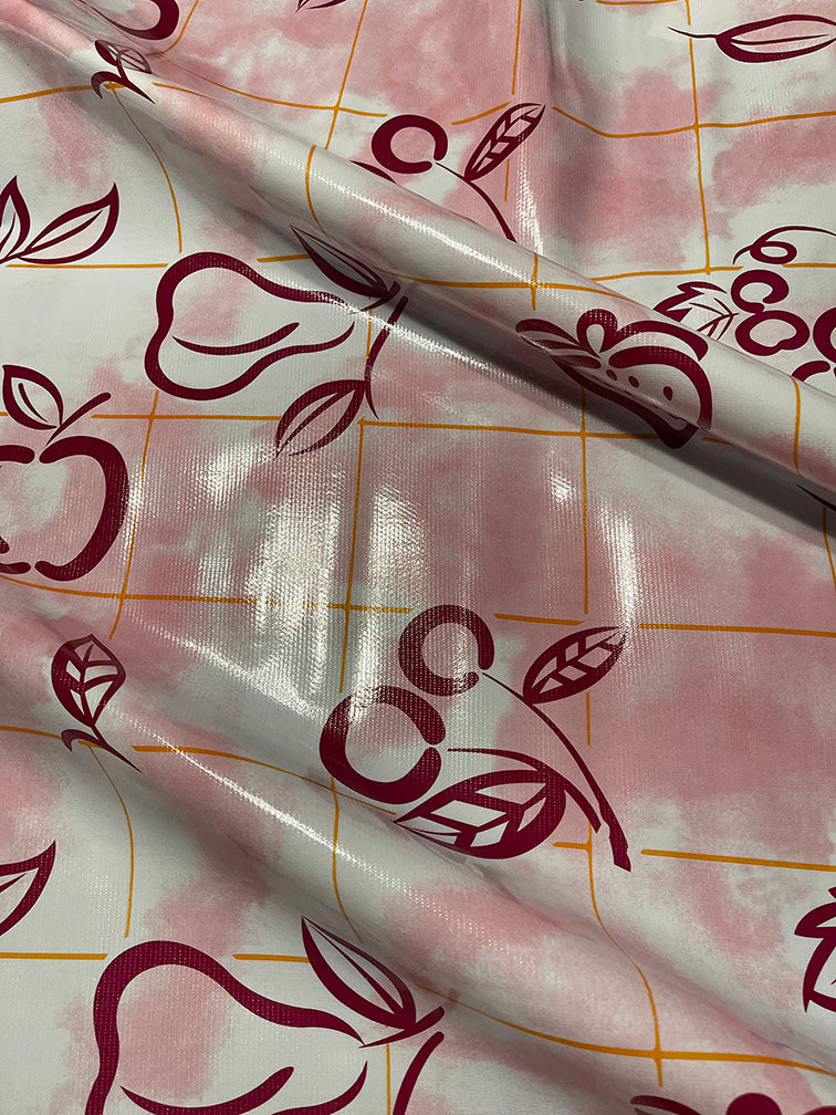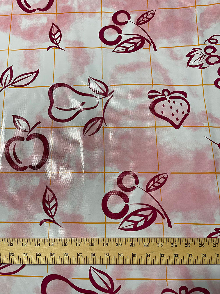 Wine Fruit Print with Orange Check Print and Pink Shading on White Oilcloth Fabric