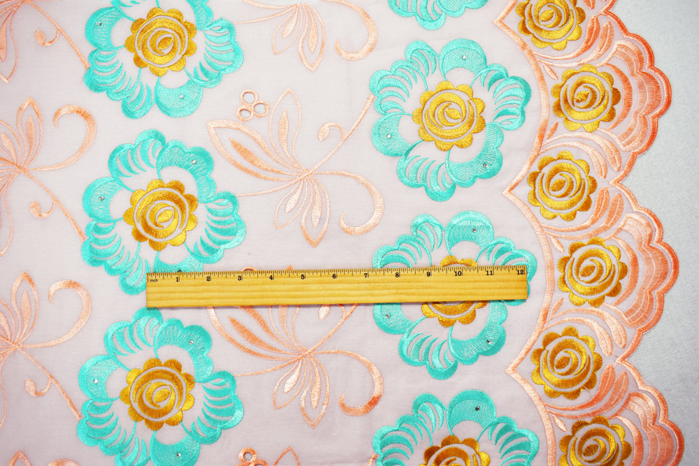 Coral Orange-Teal-Multi Poly-Cotton Floral Embroidered Scallop Eyelet Woven Fabric
