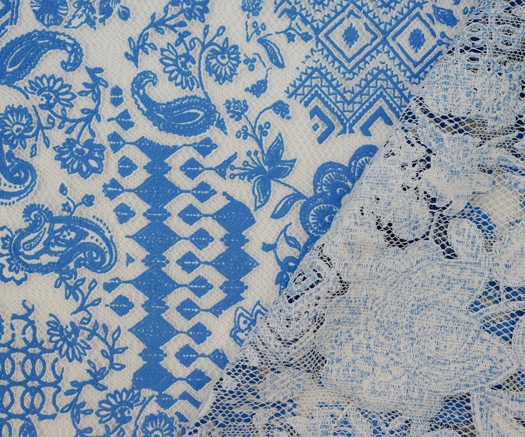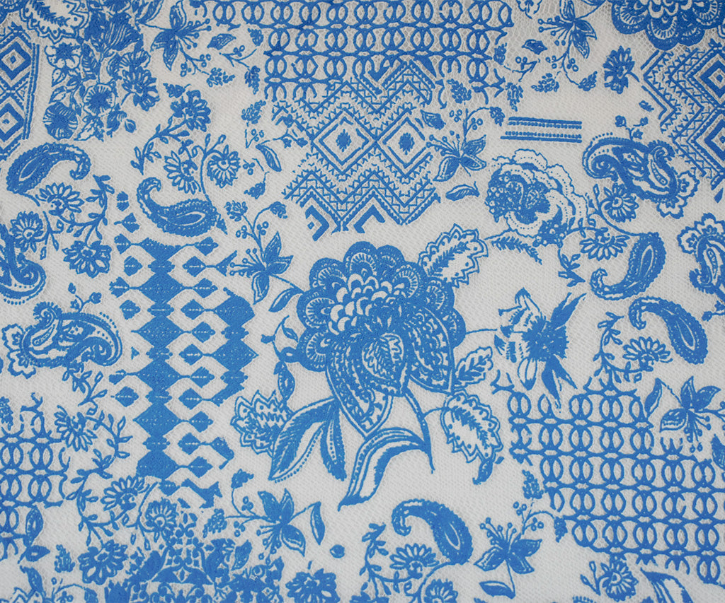Cobalt Blue-White Poly Cotton Floral Multi Pattern Lace Mesh Knit Fabric