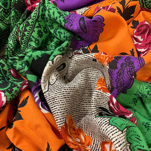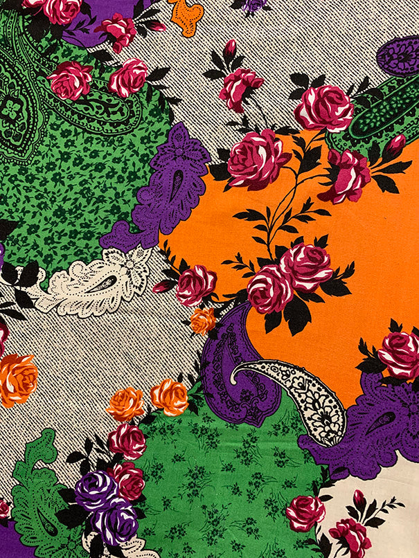 -Cream, Orange, Red, Green, Purple, White, Black, & Burgundy Multi Floral & Paisley Print Rayon Challis Fabric