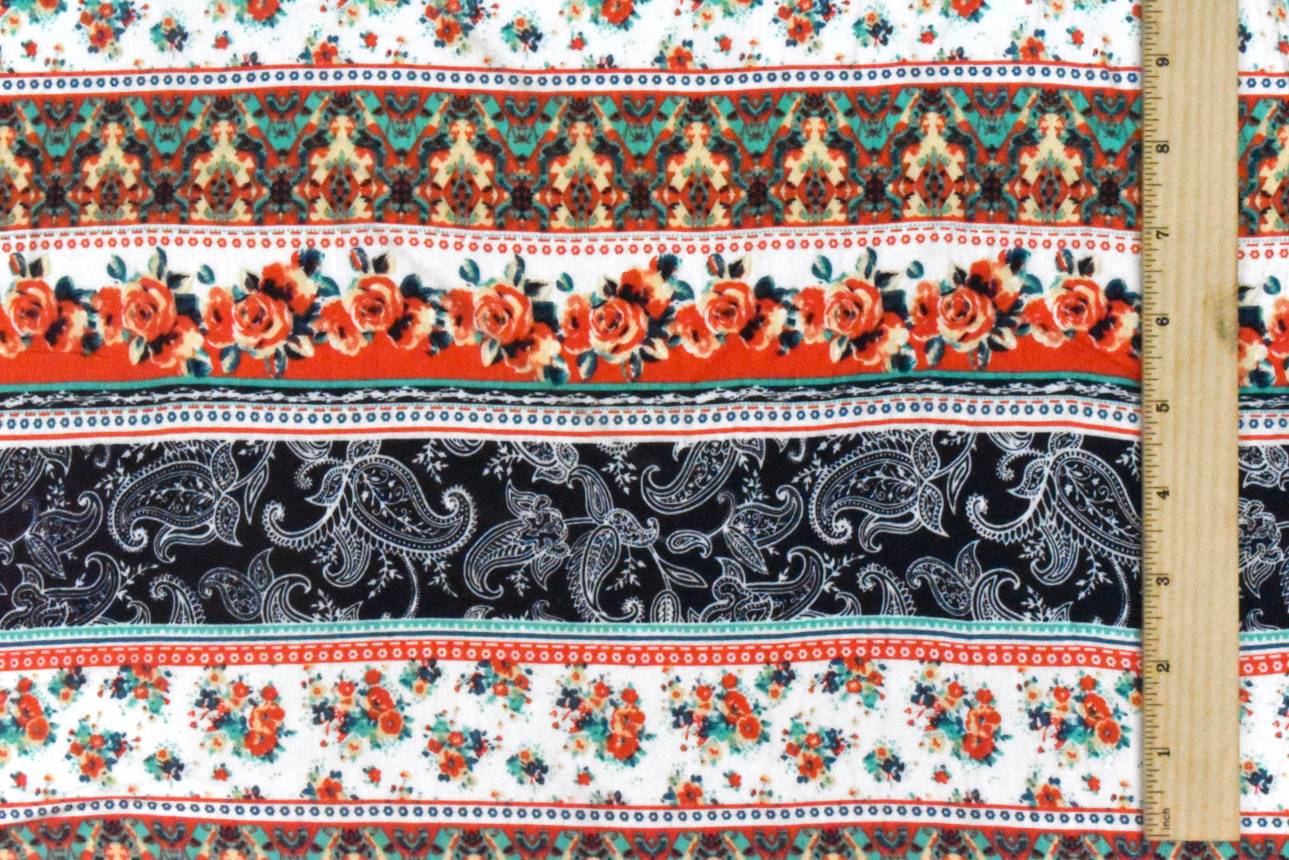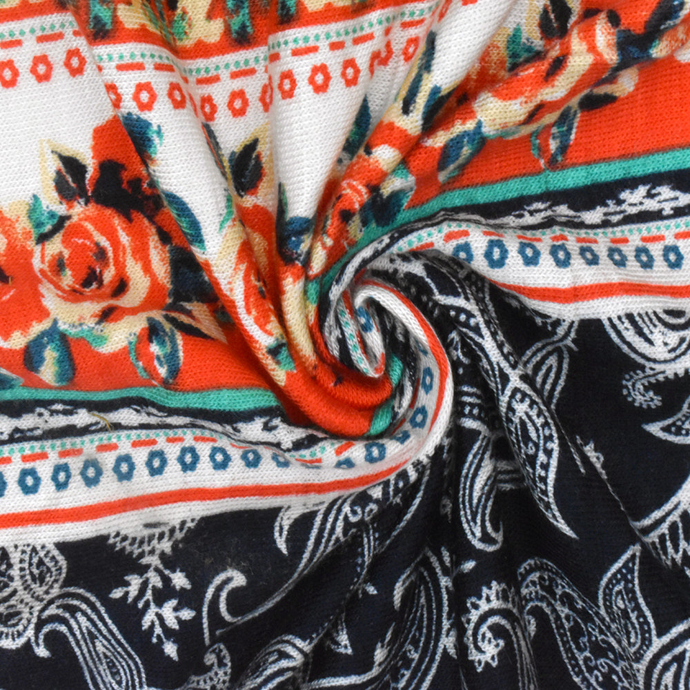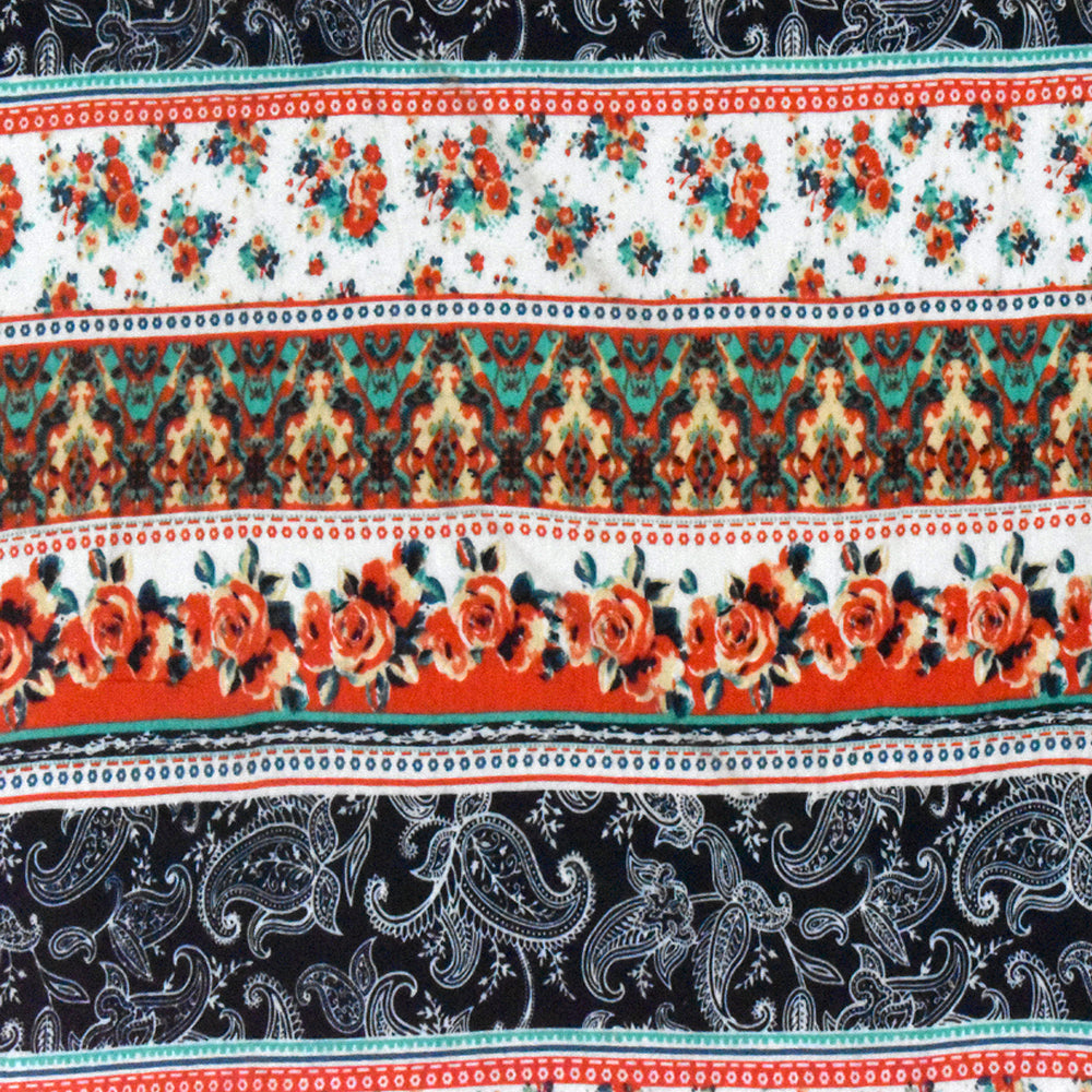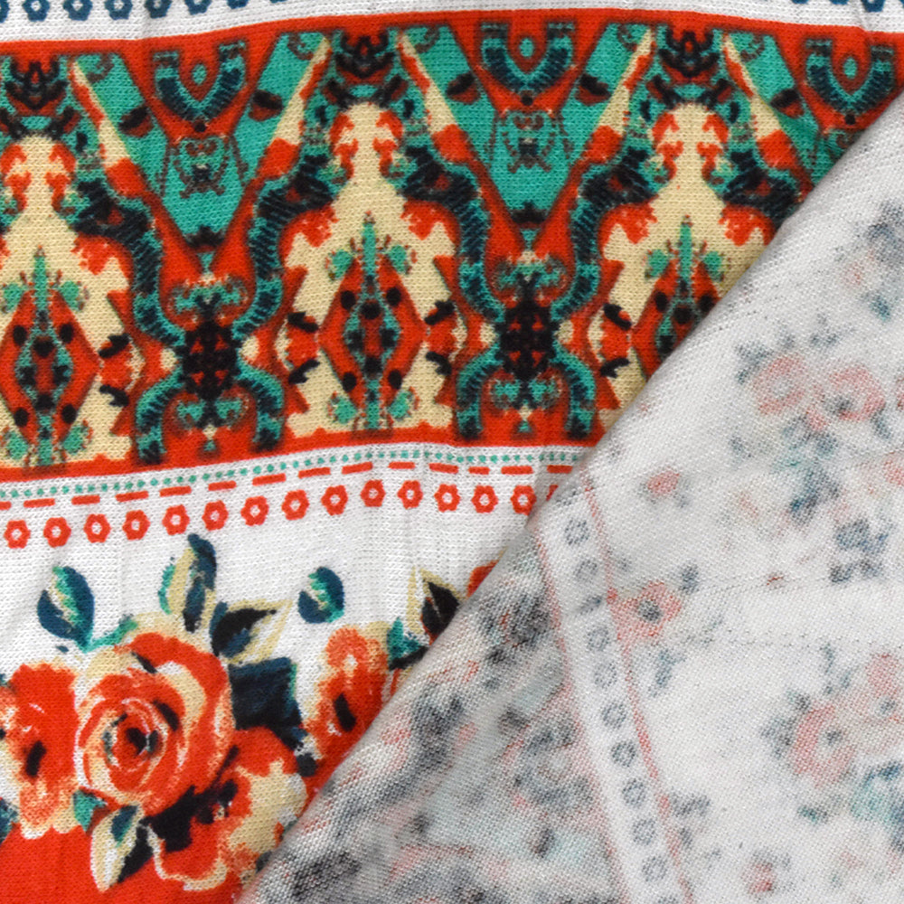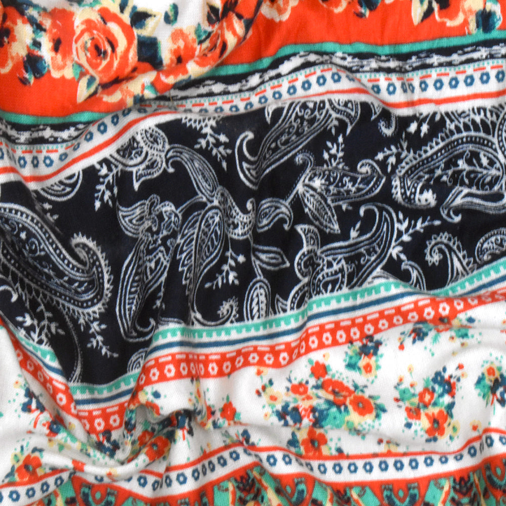 Ivory-Red-Multi Mix Pattern Stripe Printed Stretch Rayon Jersey Knit Fabric