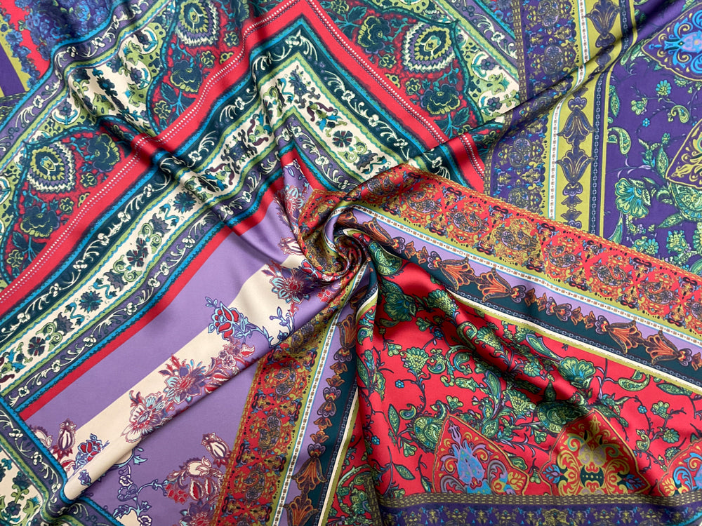 Purple-Red-Multi Polyester Bandana Border Printed Charmeuse Woven Fabric