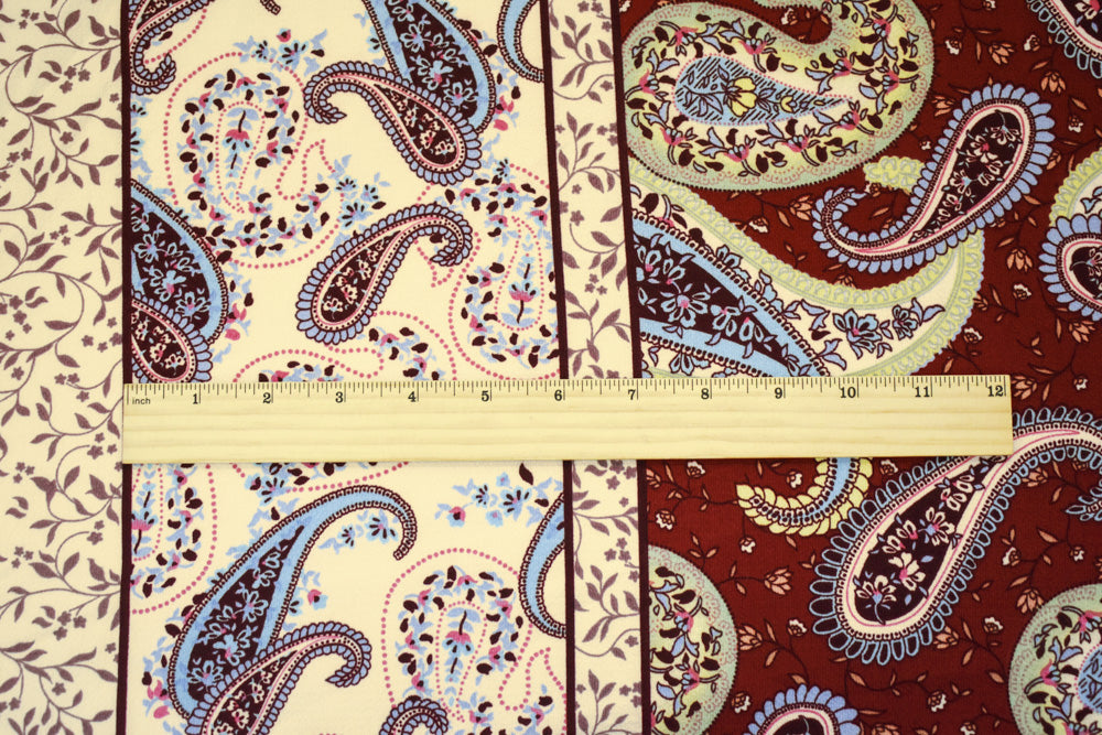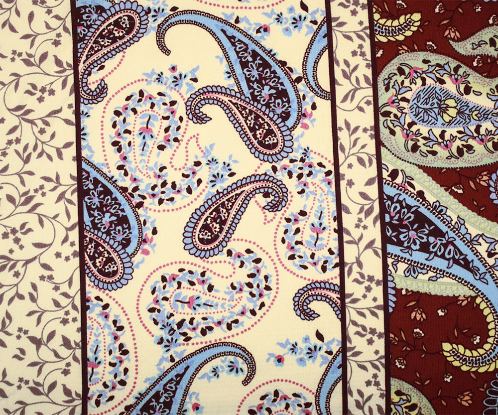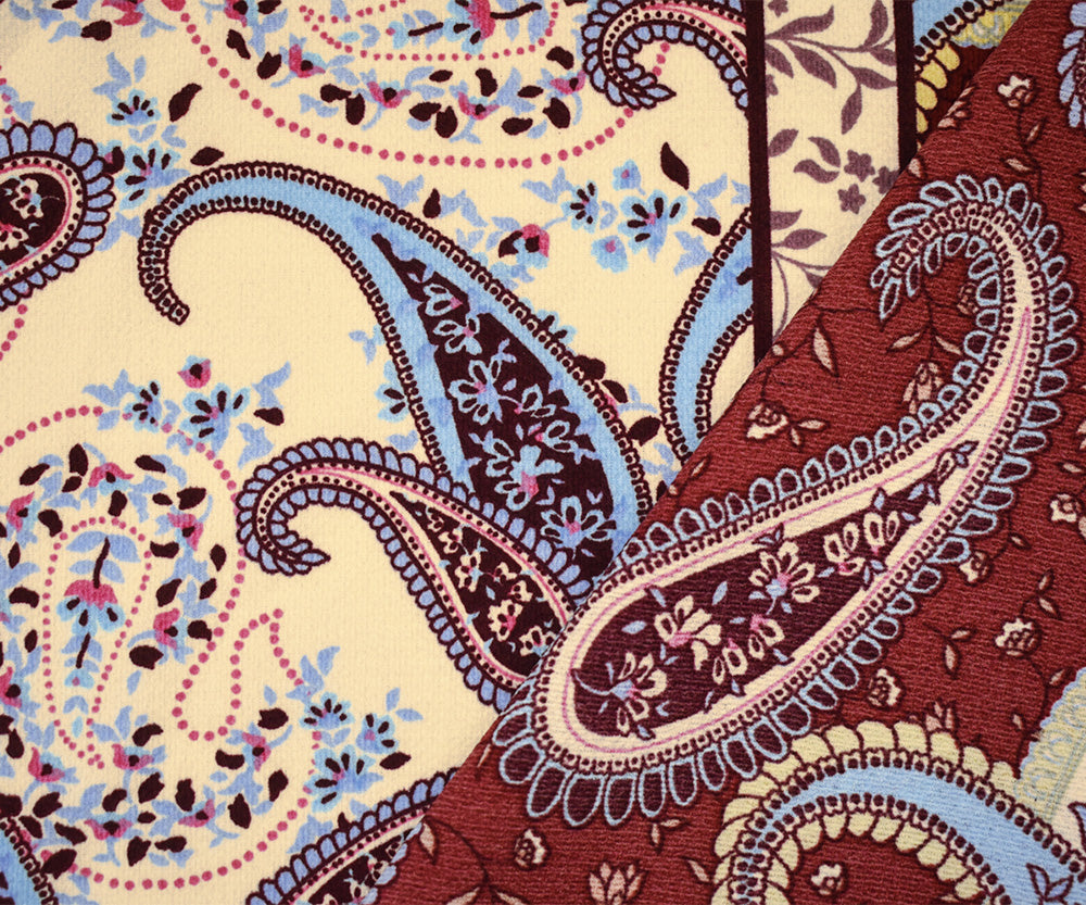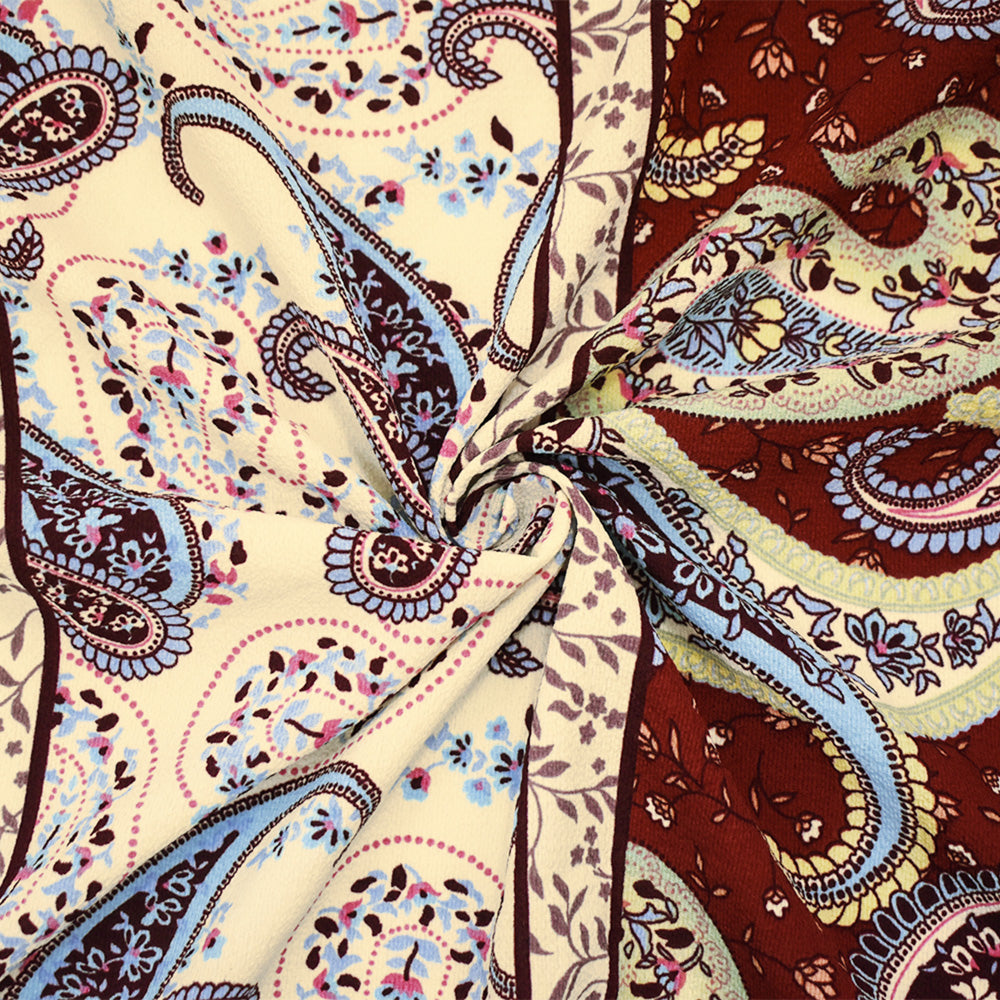 -100% Polyester pebble crepe woven fabric printed with a paisley bordered pattern
