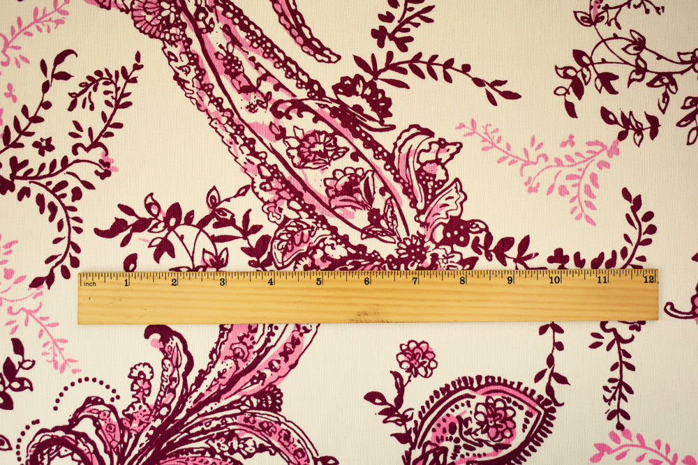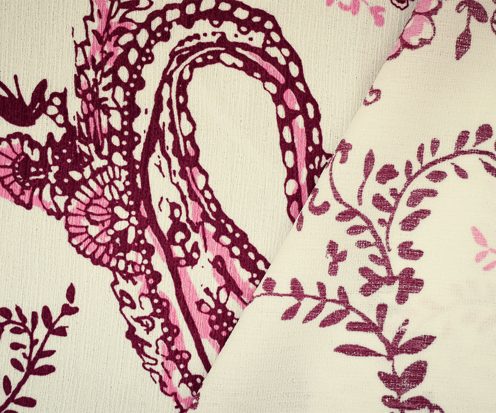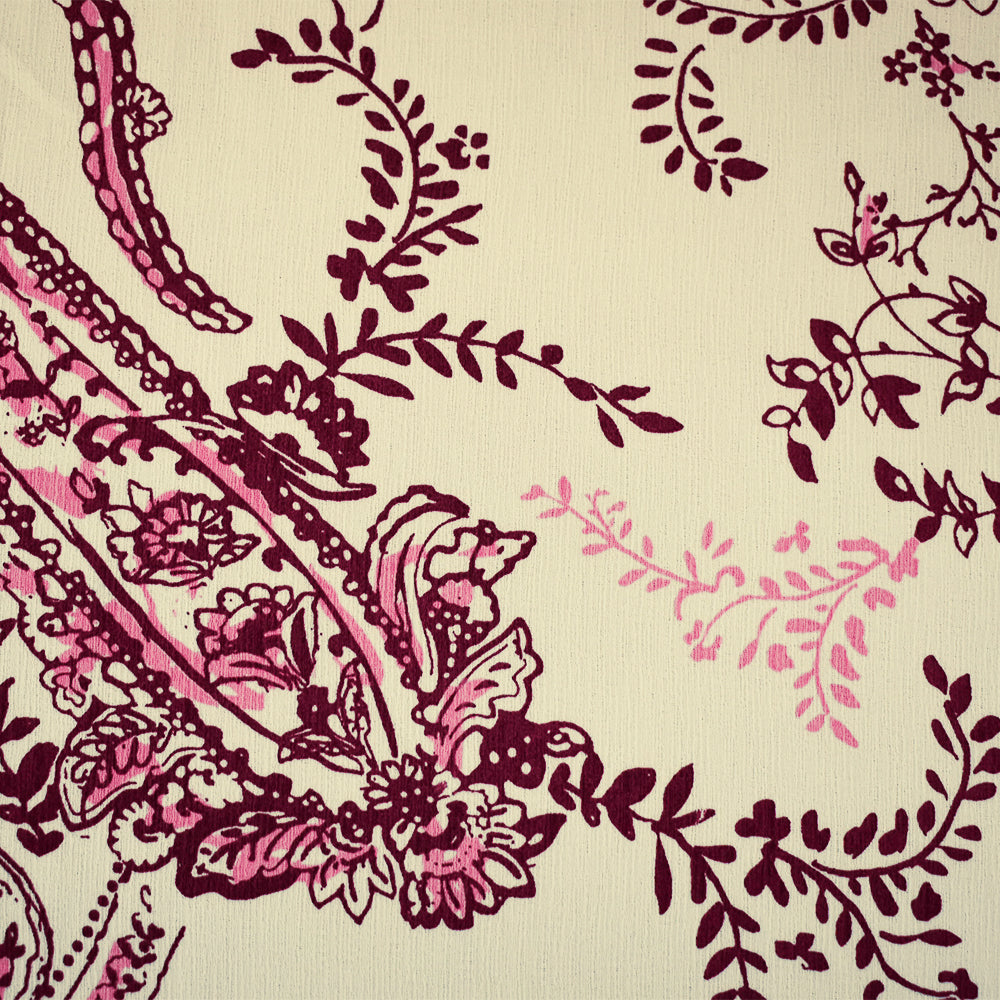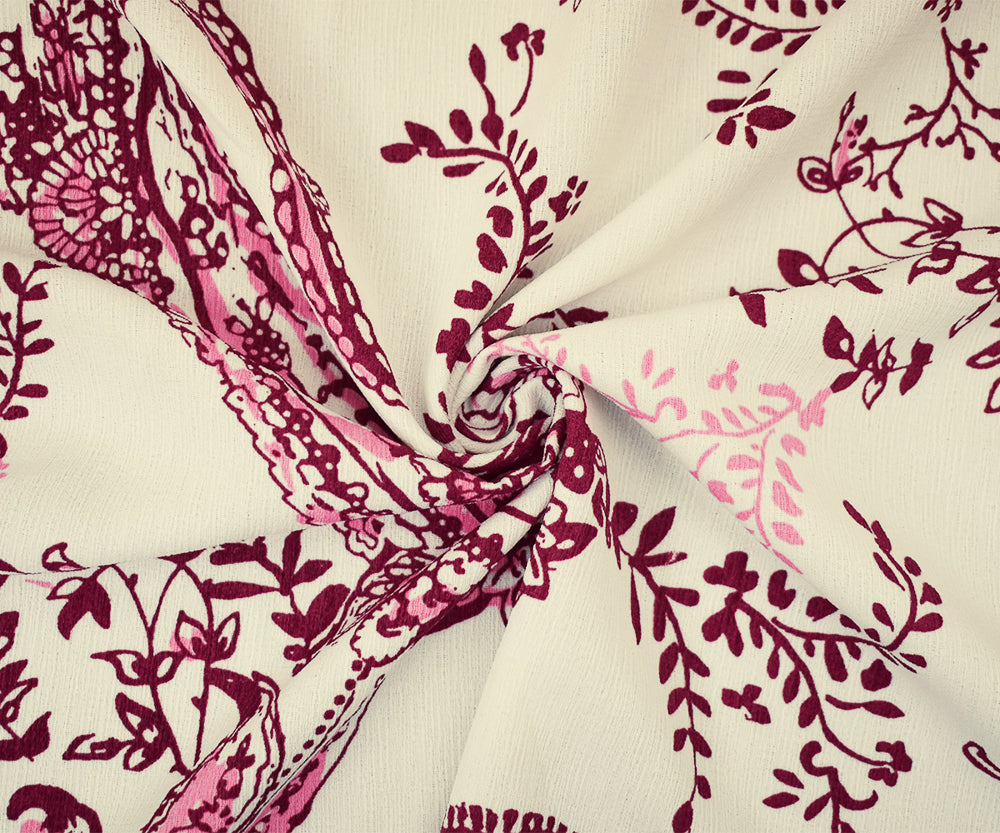 Red-White-Pink Paisley Vine Printed Poly Slub Momie Crepe Woven Fabric