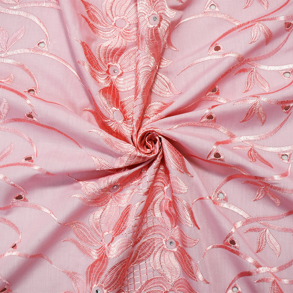 1 3/4 YD PC-Pink Poly-Cotton Embroidered Floral Scallop Rhinestone Woven Fabric