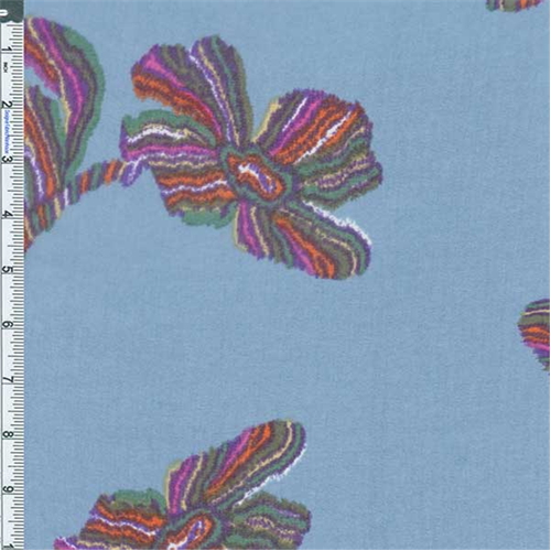 Chiffon Fluttering Flower Print Fabric By the Yard, Blue. Sheer, very light-weight printed chiffon with slinky drape and dry hand-feel. Suitable for blouse or dress overlay silhouettes, use a lining or underlay garment if opacity is desired. Machine wash cold gentle or hand wash, tumble dry low or air dry for best results, do not iron.