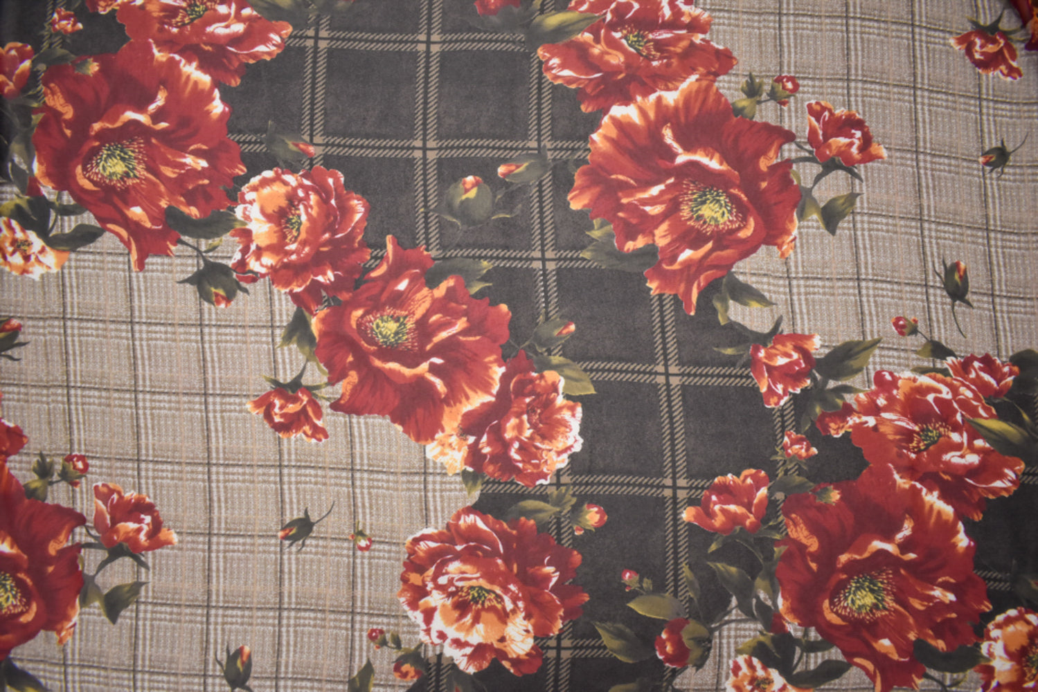 Beige-Red-Multi Poly Plaid Floral Printed Chiffon Woven Fabric