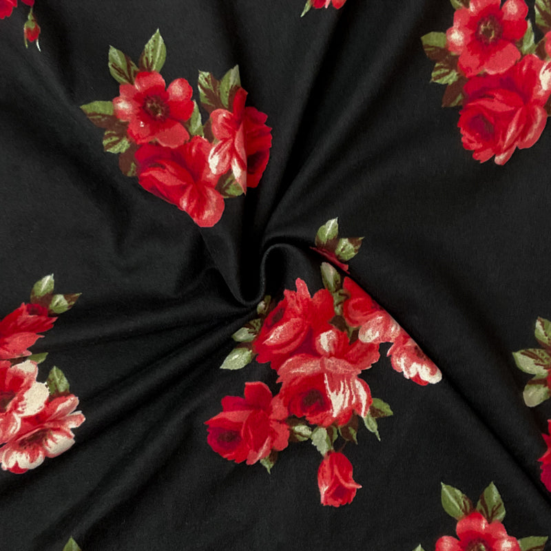 Black-Red Poly Stretch Floral Print DB Jersey Knit Fabric