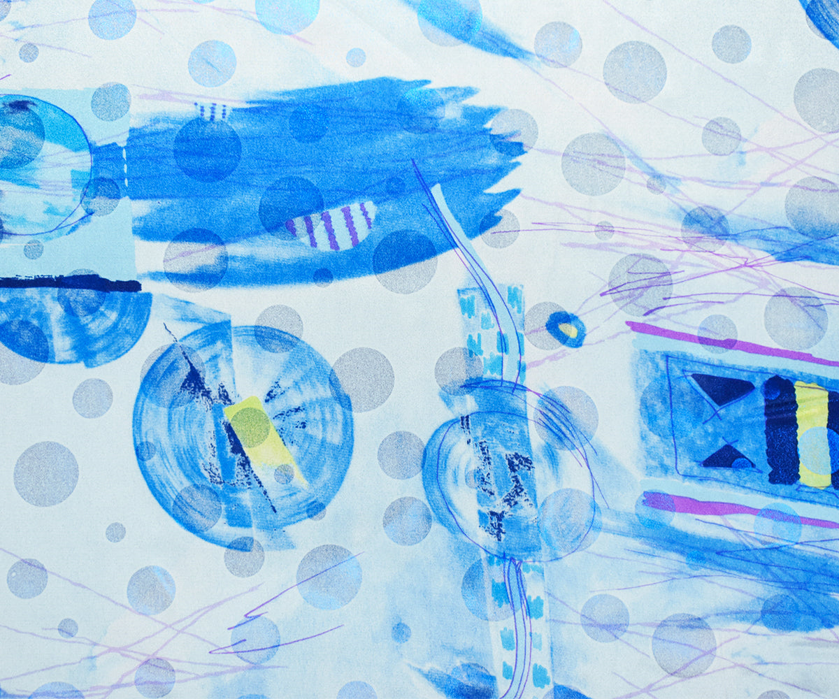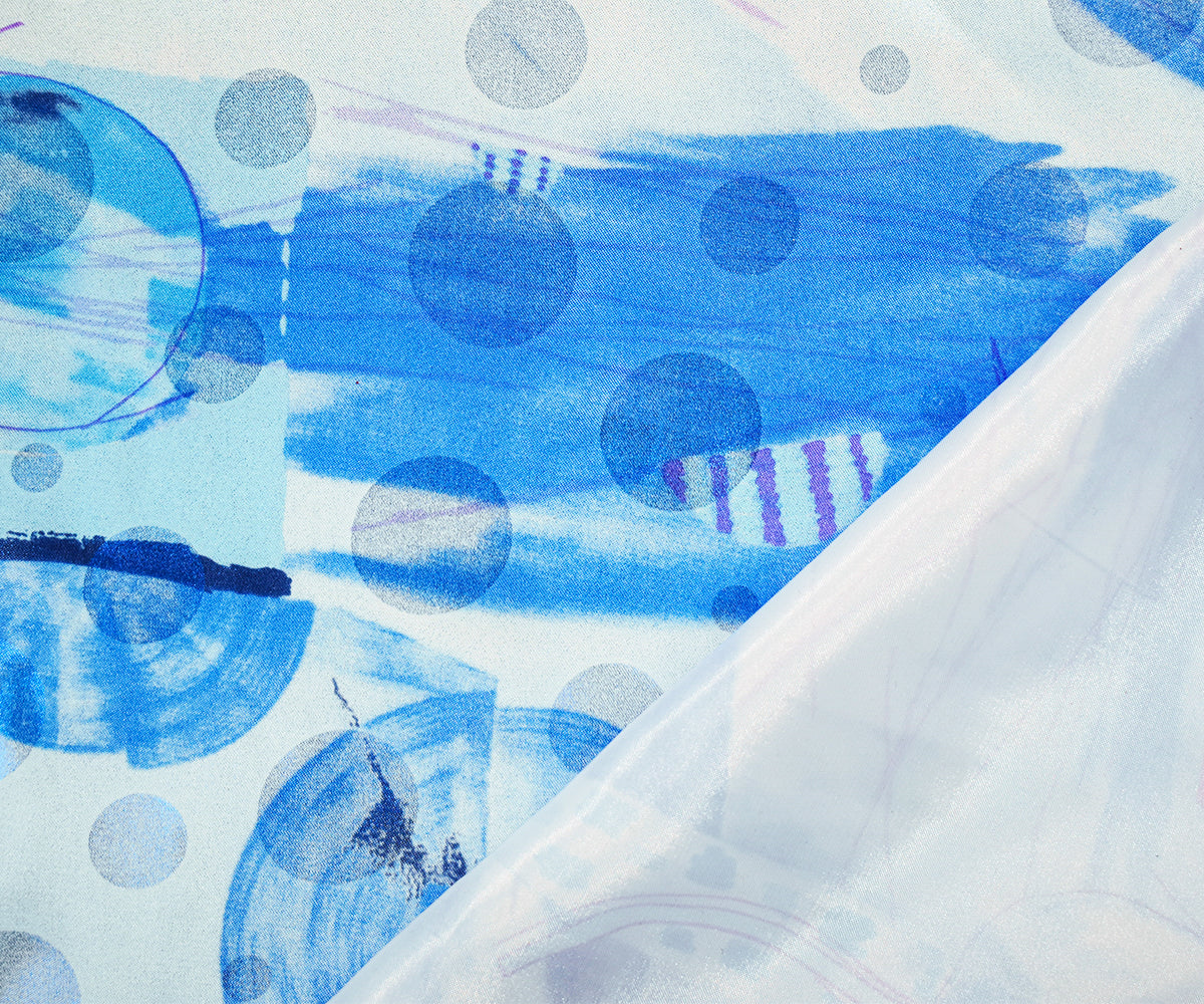-100% polyester satin woven fabric printed with an abstract water-color inspired pattern with iridescent dots