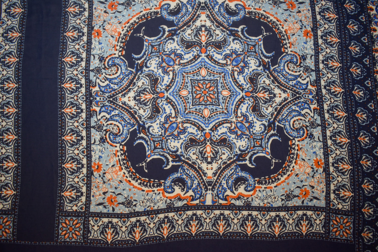 Blue-White-Orange Poly Moroccan Bandana PANEL Printed Chiffon Woven Fabric