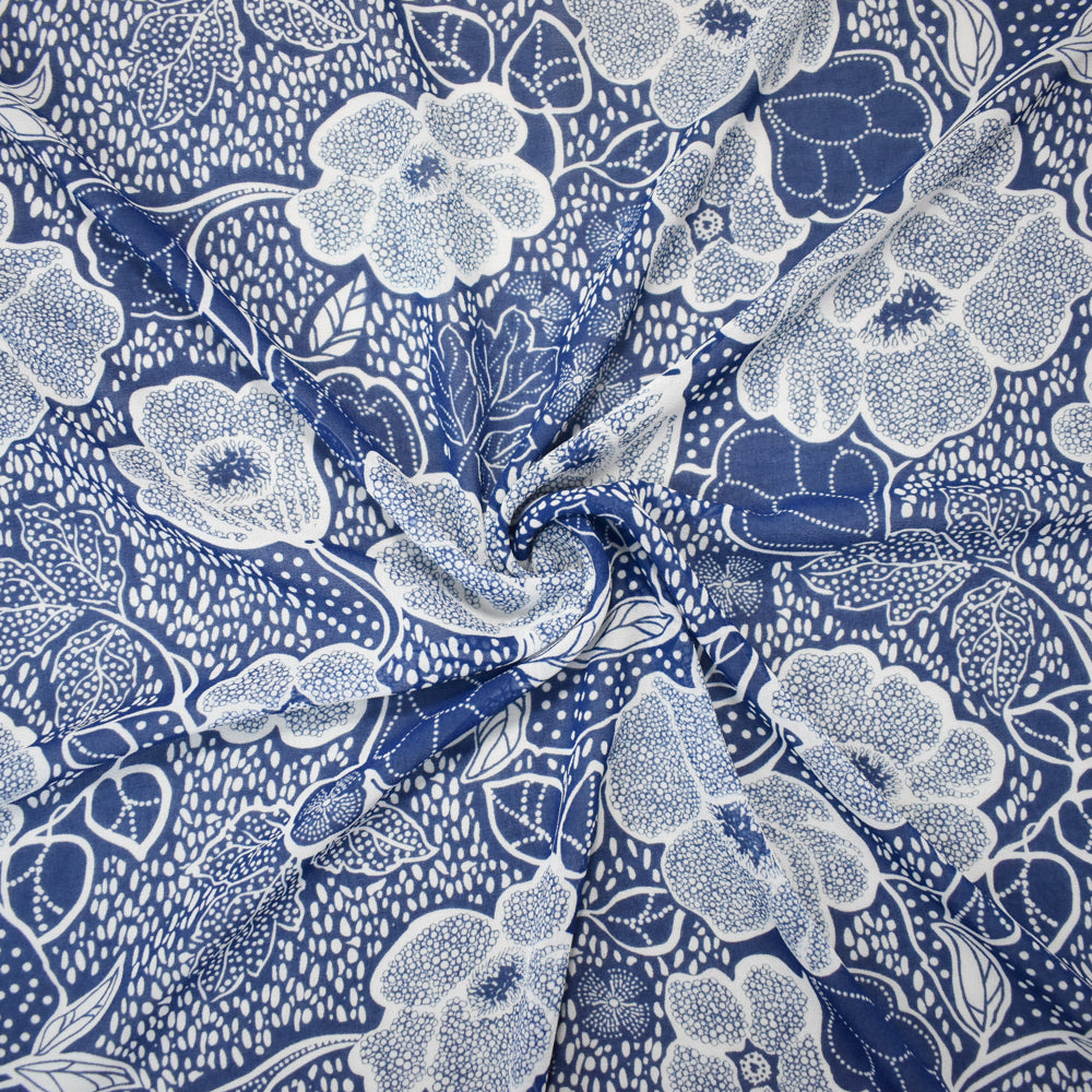 -Blue-White Poly Floral Printed Pebble Chiffon Woven Fabric