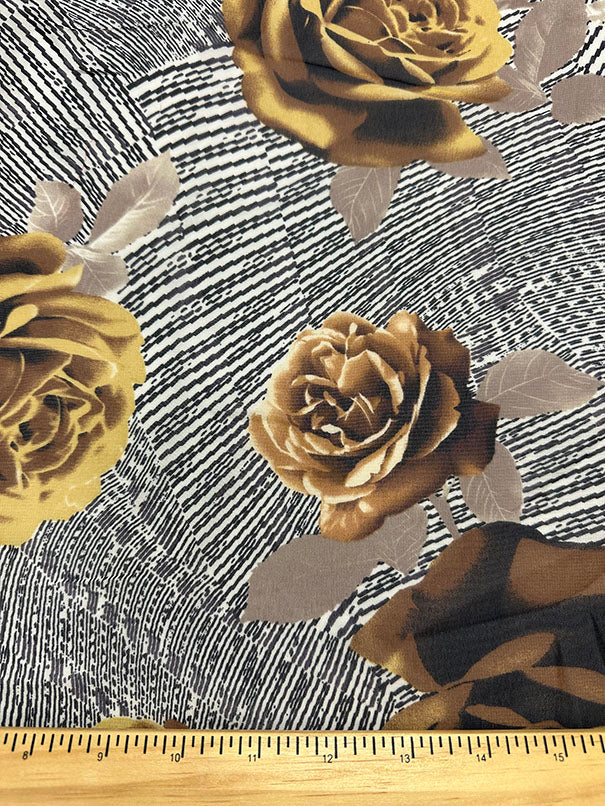 -Gold, Tan, & Yellow Roses Floral Print on Black & White Multi Direction Stripe Print Sheer Poly Chiffon Fabric