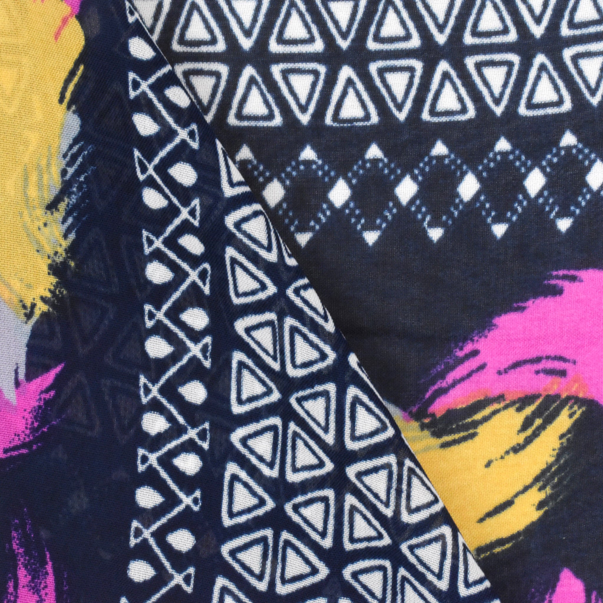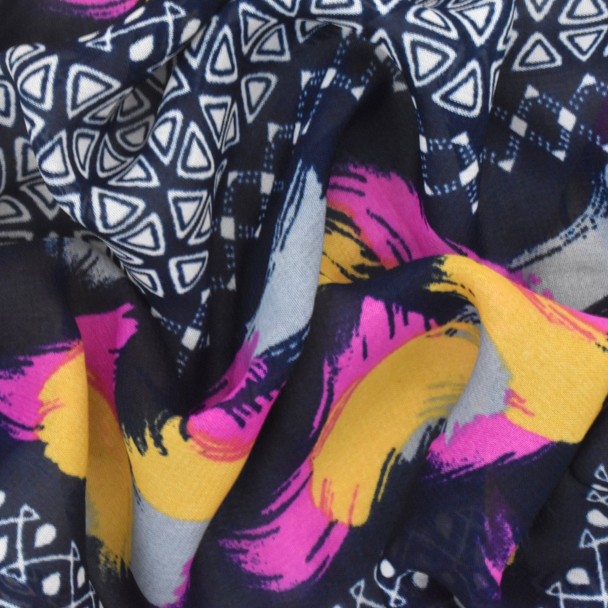 -Painting brush-like motifs with Aztec stripe printed on a chiffon woven fabric