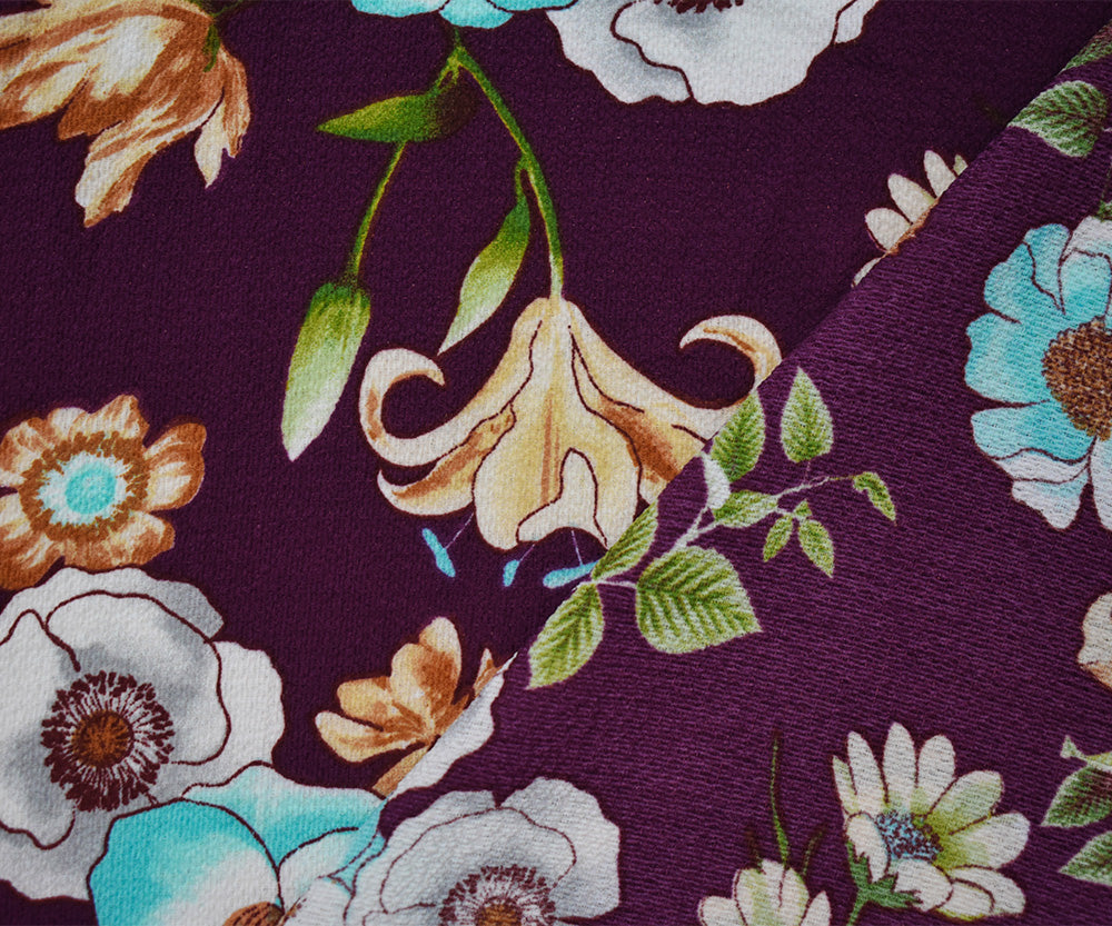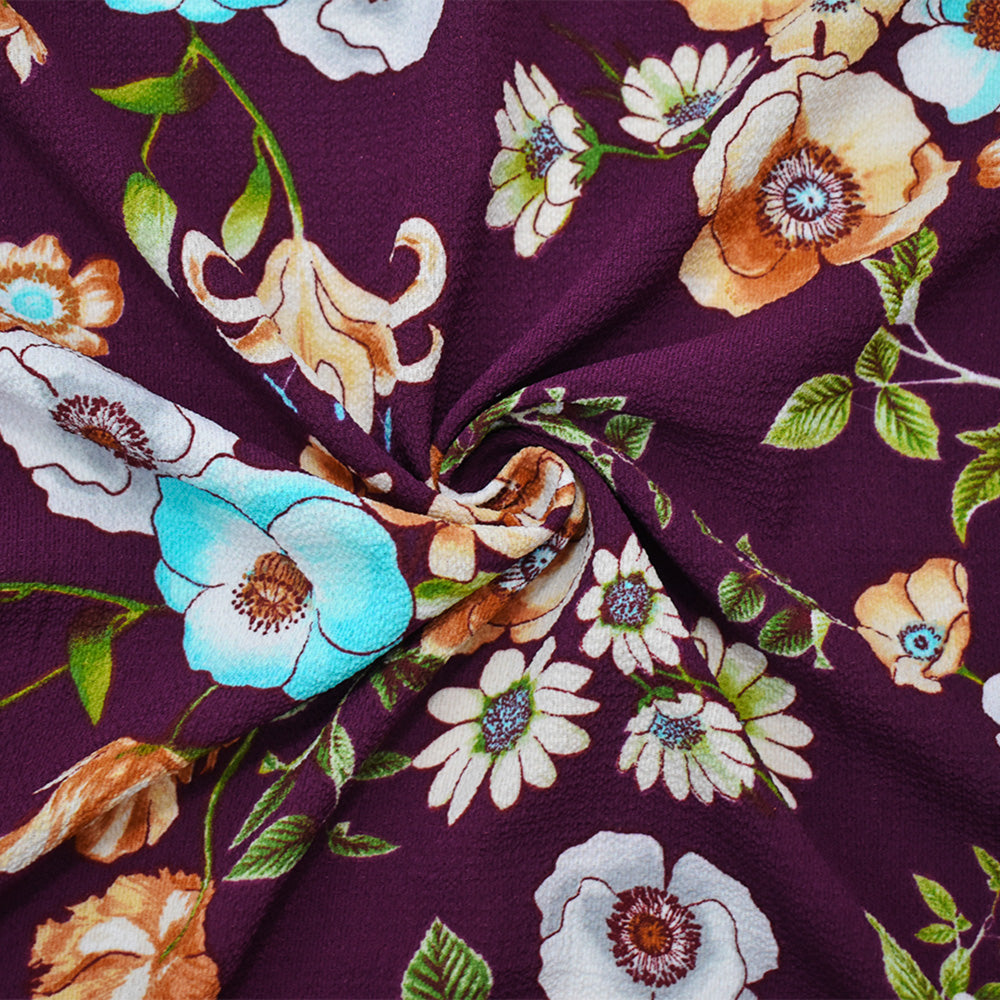 1 YD PC-Burgundy Red-Brown-Multi Poly Floral Printed Pebble Crepe Woven Fabric