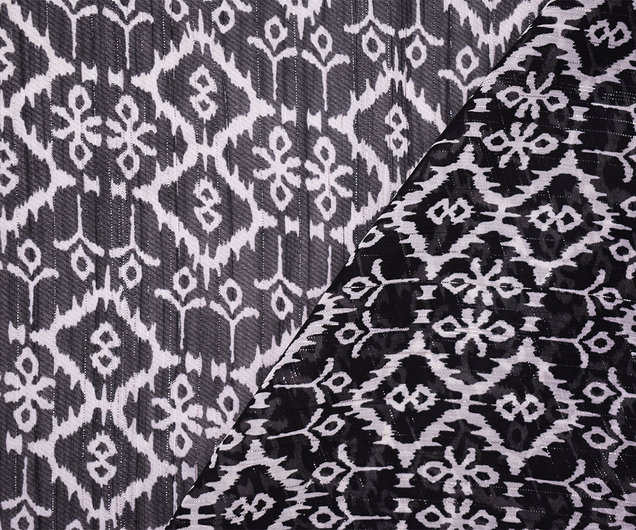 Black-Purple Poly Tile Abstract Ikat Printed Silver Stripe Chiffon Fabric