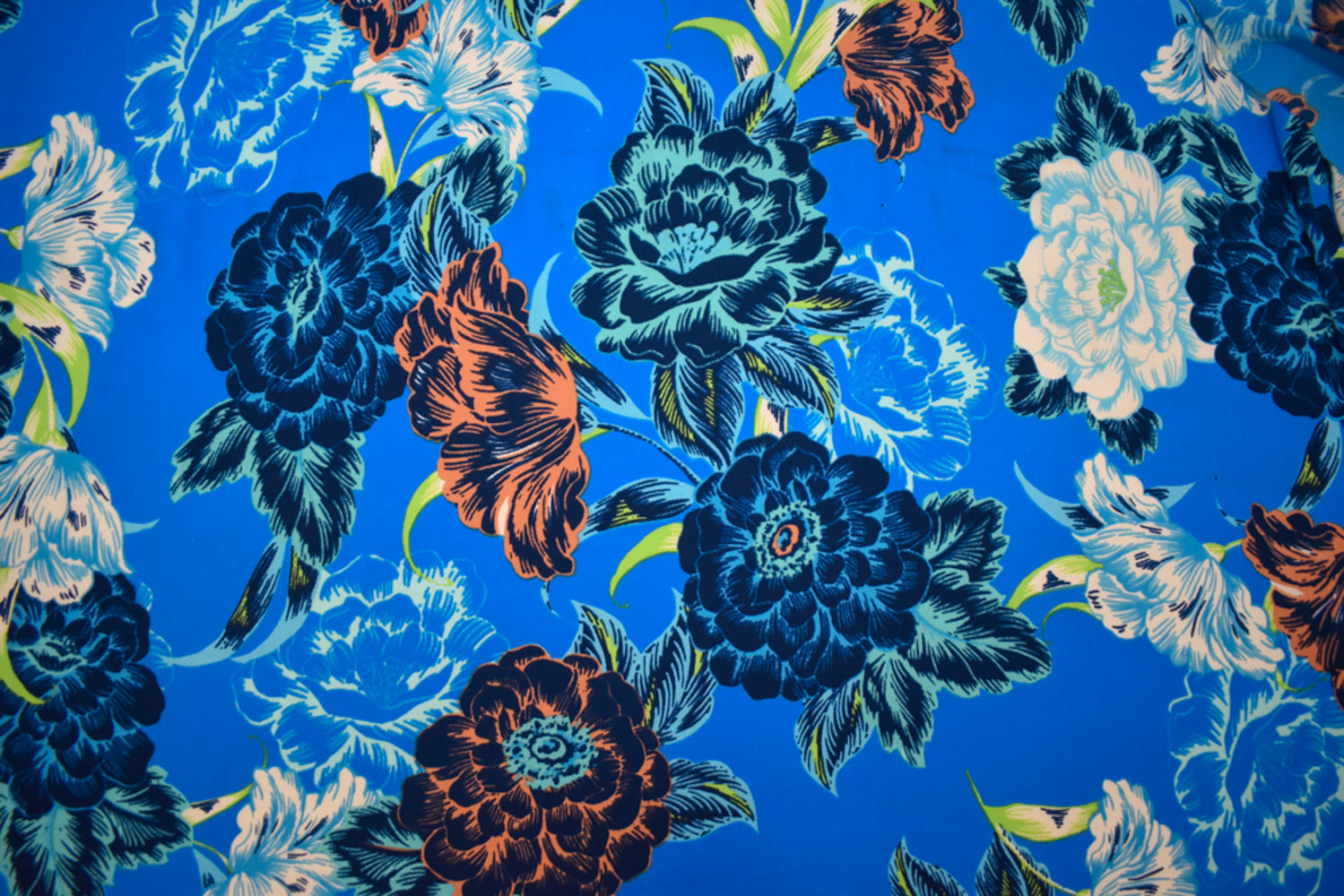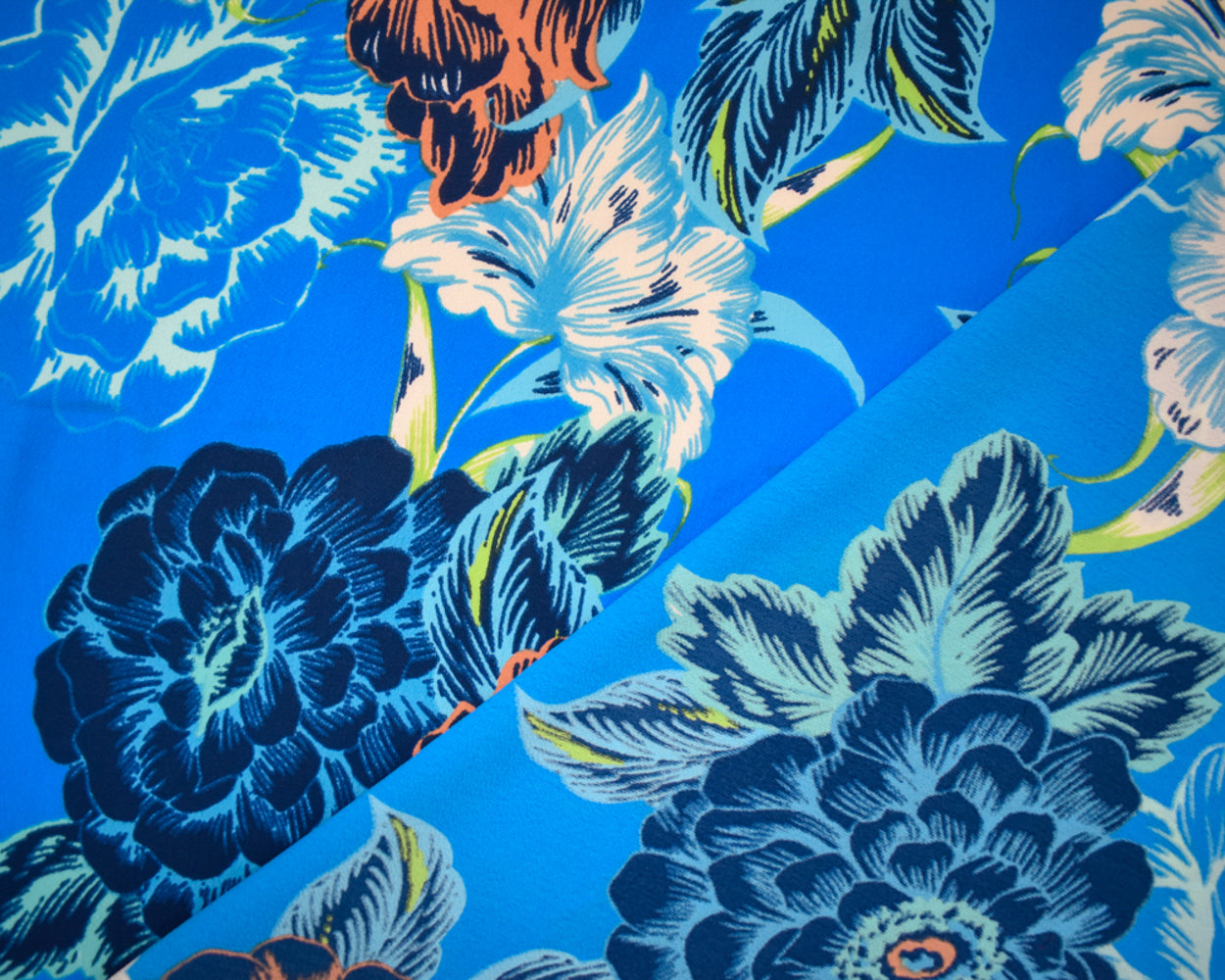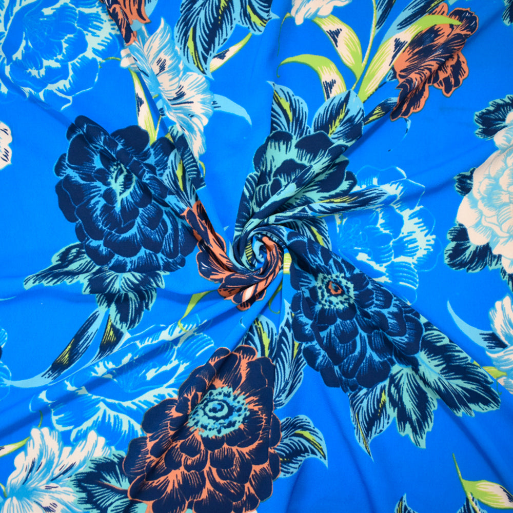 Blue-Turquoise-Multi Poly Floral Print Pebble Crepe Woven Fabric