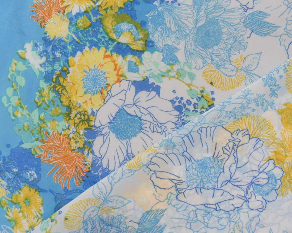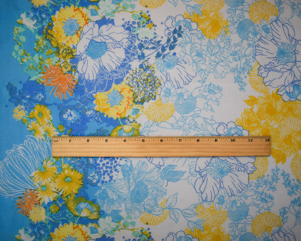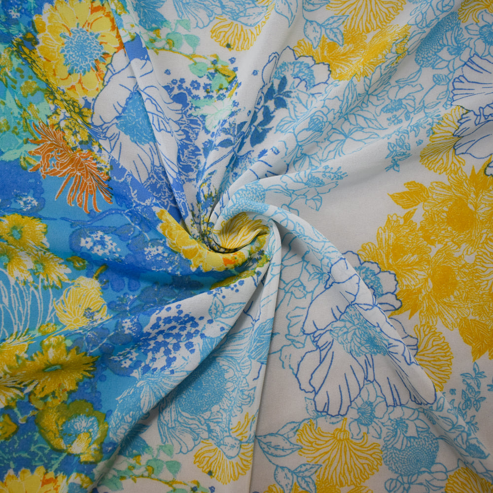 Blue-White-Multi Poly Floral Border Printer Chiffon Woven Fabric