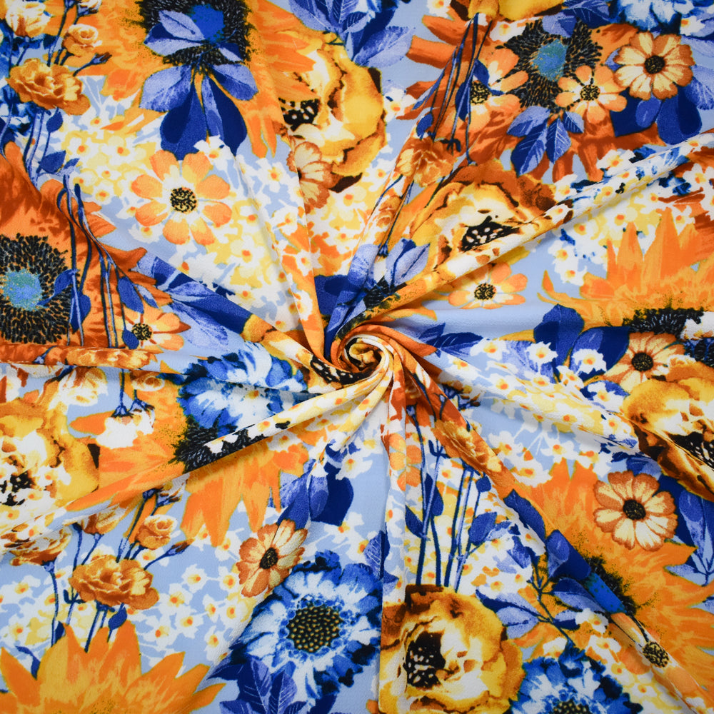 Orange-Blue-Multi Poly Floral Print Pebble Crepe Woven Fabric